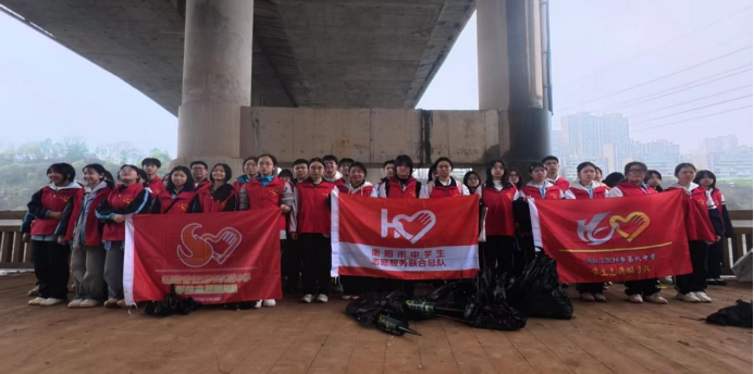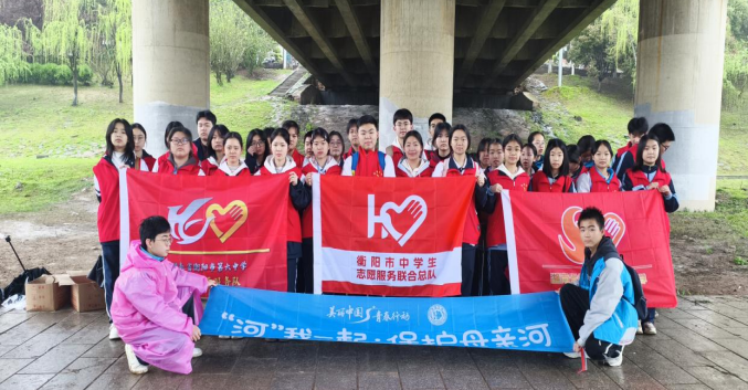 活动间隙,志愿者们在桥梁下整齐列队,高举“衡阳市中学生志愿服务联合总队”“衡阳市实验中学学生志愿服务队”旗帜与“‘河’我一起·保护母亲河”横幅合影留念,定格下青春与责任的美好瞬间。