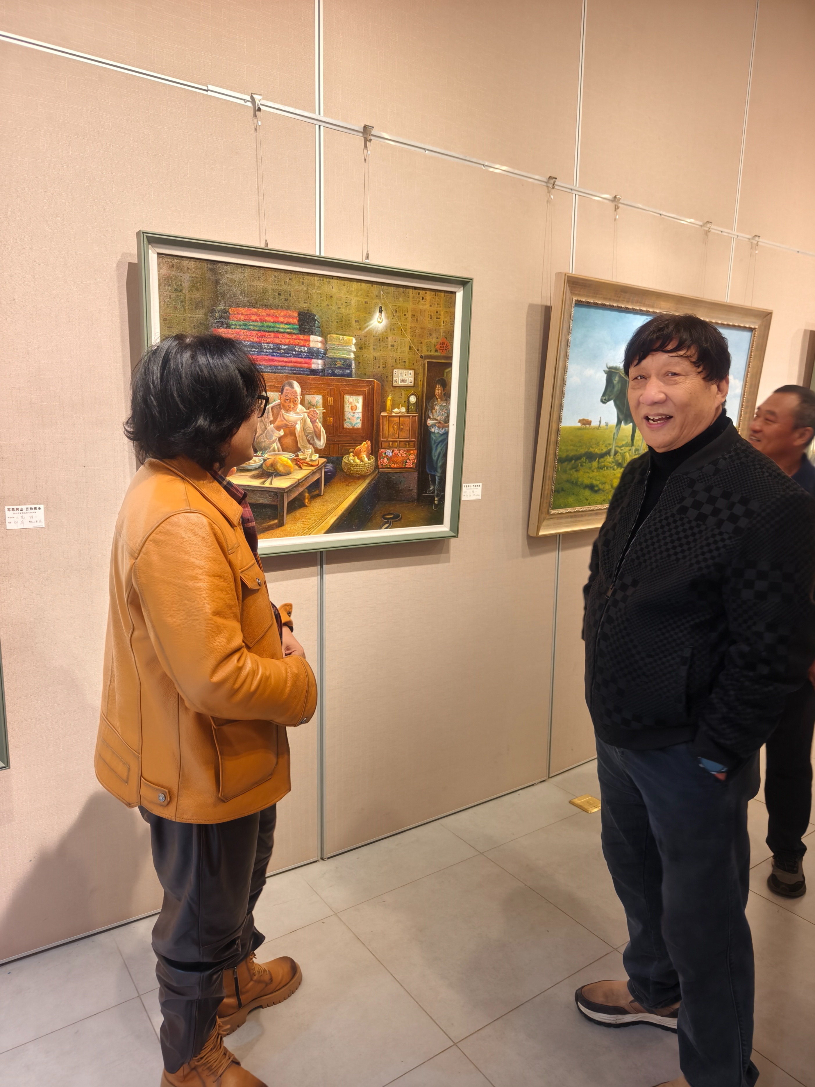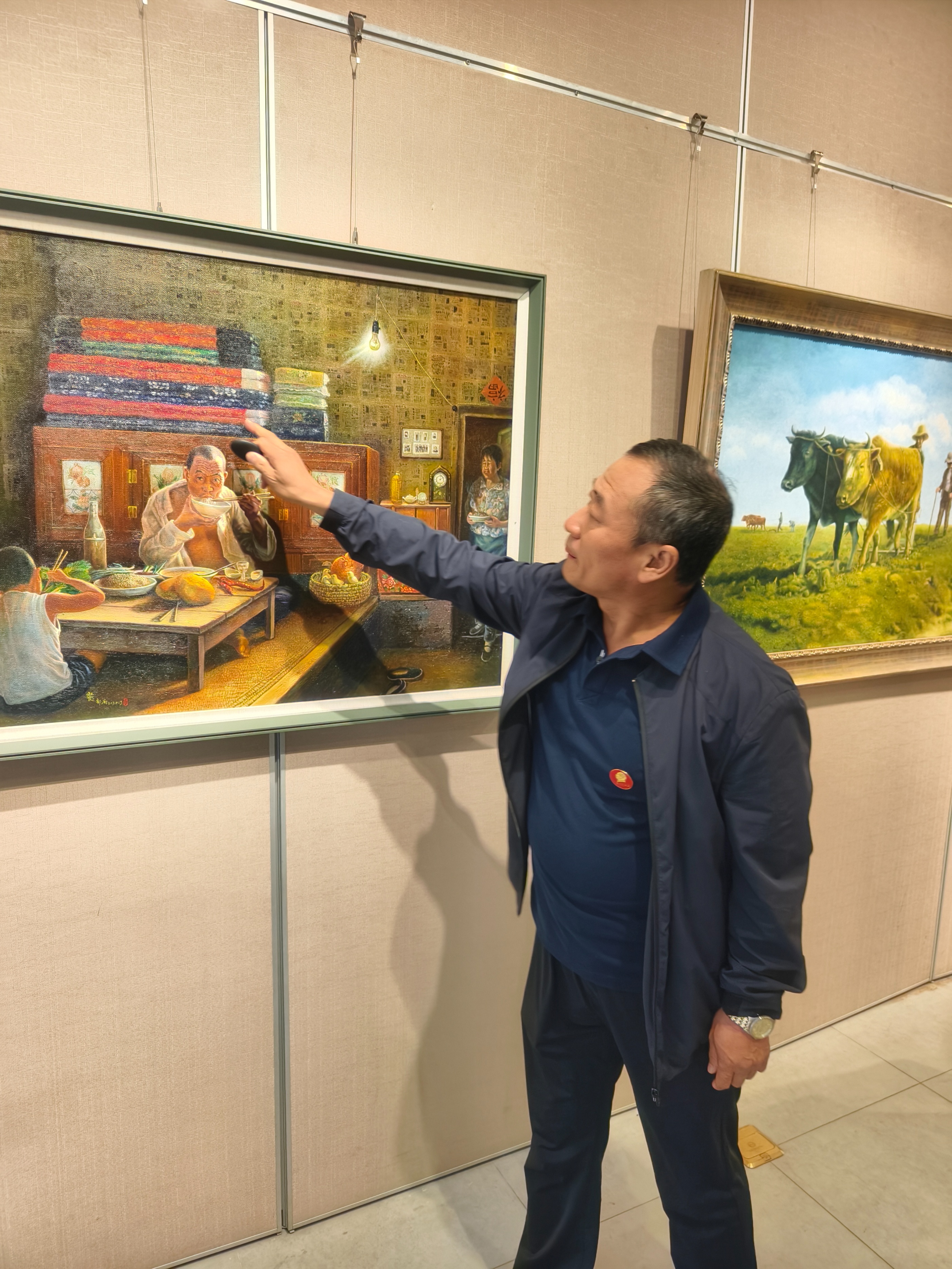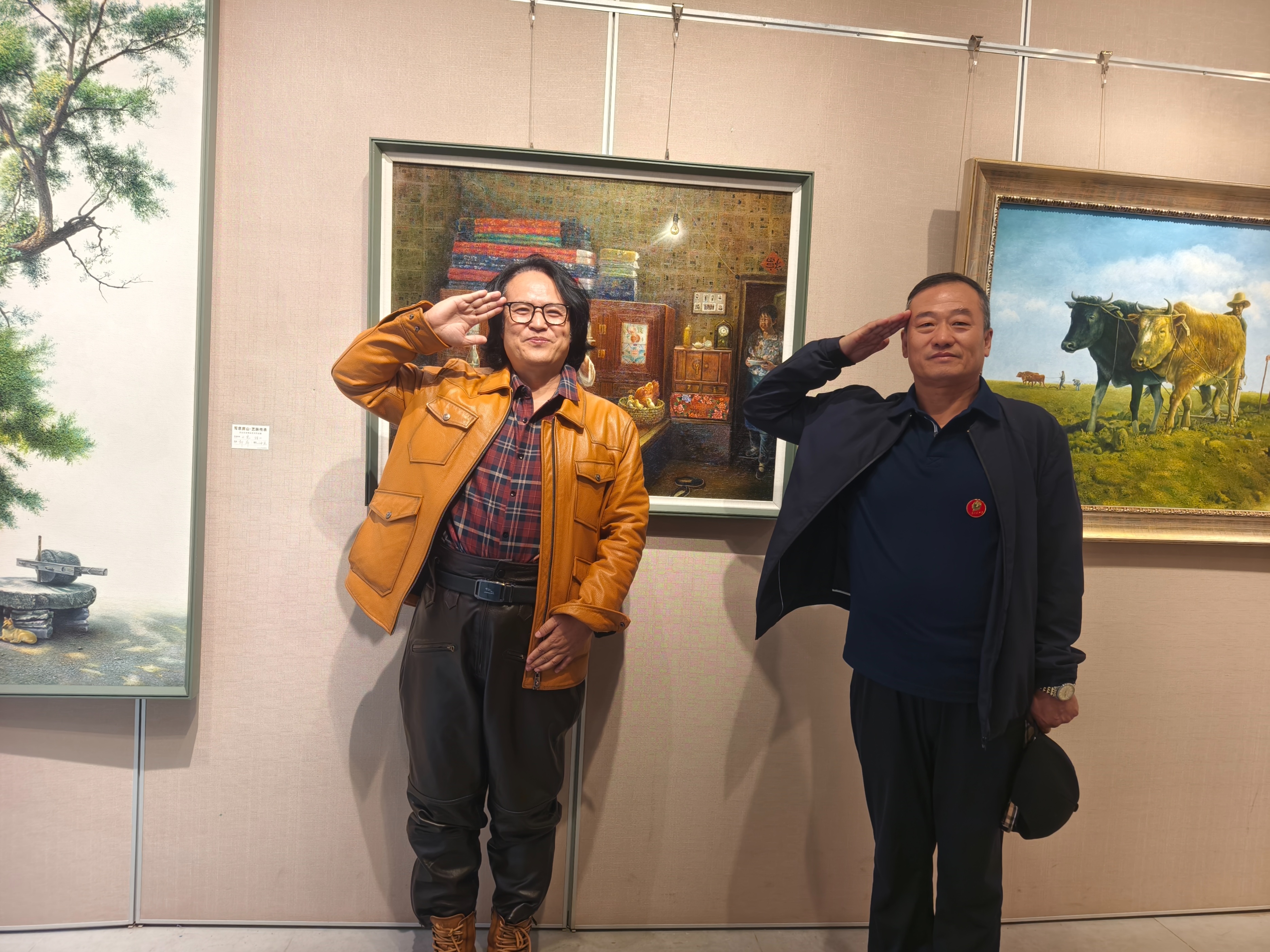 享受国务院特殊津贴的中医专家刘财(军人出身),在《农家晚餐》前驻足良久,他指着画面中的被褥、座钟与老式电灯感慨:“这些细节一下子把我拉回童年的农村生活,作为外行人,我能从画里摸到‘生活的温度’”,随后他与郭廓在作品前互敬军礼合影,称 “这是艺术与记忆的共鸣”。