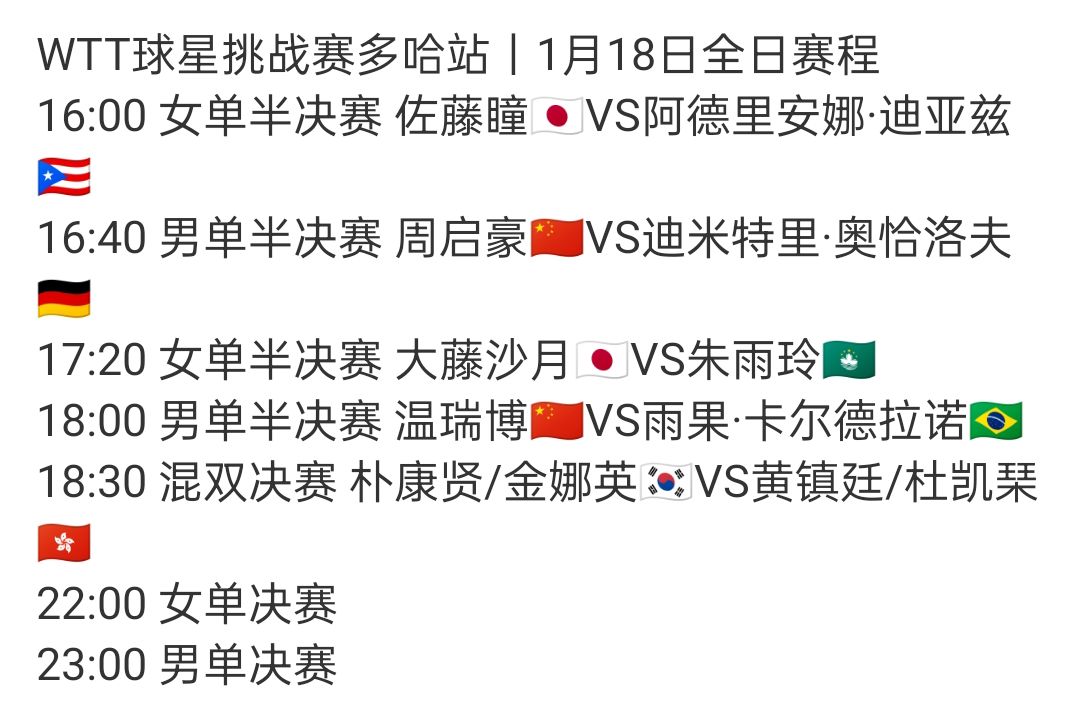 2026年1月18日,乒乓球WTT多哈球星赛来到第六个比赛日,此前女双和男双决赛结束,大藤沙月/横井咲樱和张禹珍/赵大成夺冠,接下来将诞生最后三冠,国乒男单力争登顶,对战两大高手。