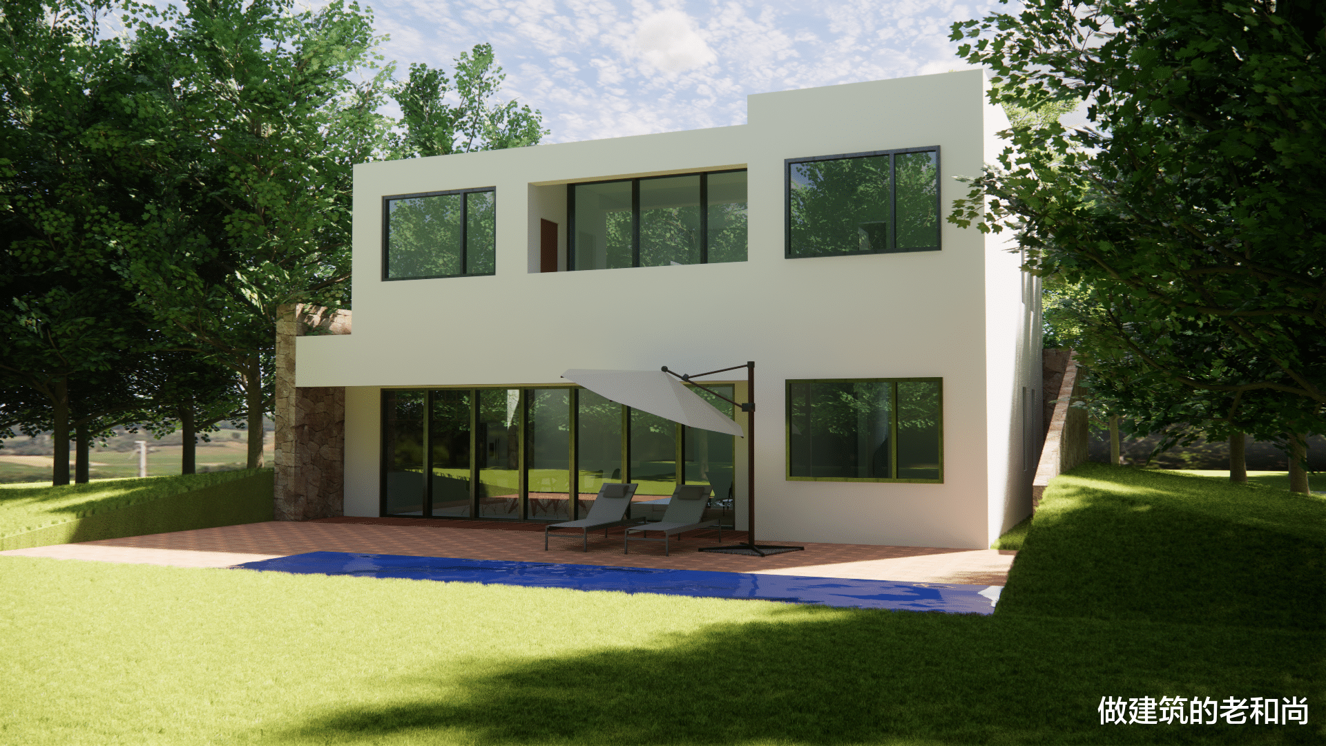 建筑的立面也主要以临街一侧为主,层次高低错落比较丰富,为了节省不必要的浪费,更是以一个雨棚的形式来形成半开放的停车区。而背靠后部开放的后院,则是以形式追随功能的形式来处理,并未有过多的干预。后院开放的硬地区中,便以一个开放的露天泳池作为主要对象。
