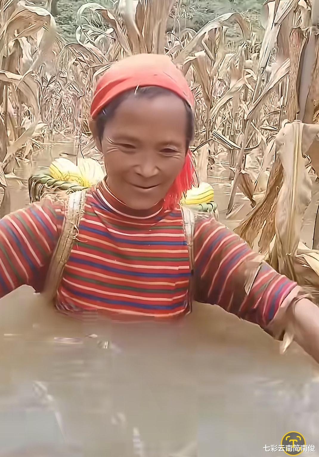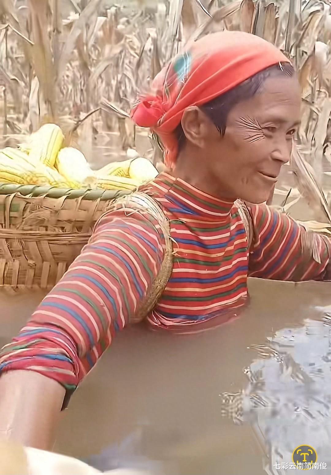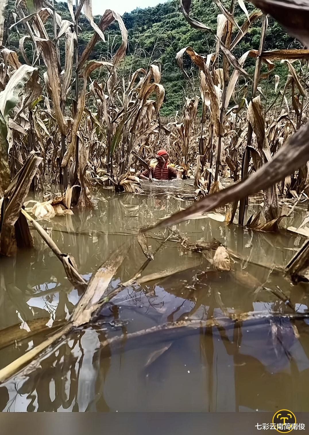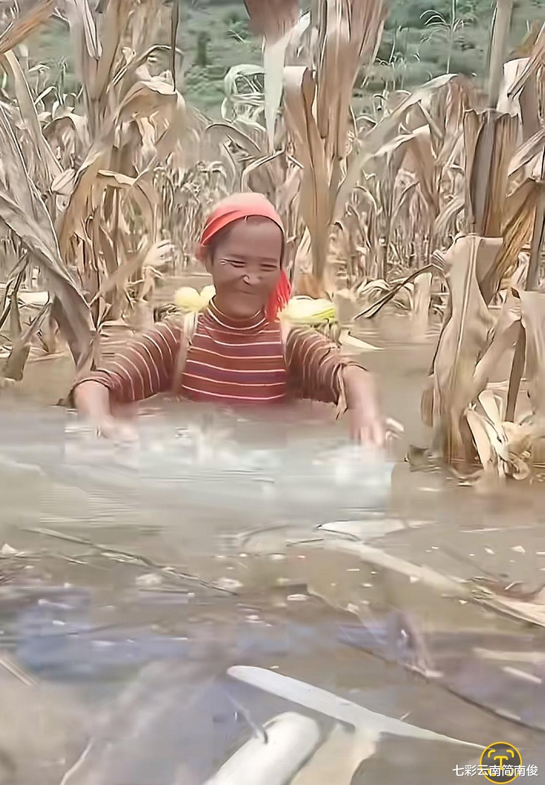 从现场可知,田地积水严重,水位较深,玉米地宛如水田。云南省文山州村民行走在水潭之中,将玉米背到岸上,纯朴的画面,令人感到心酸。