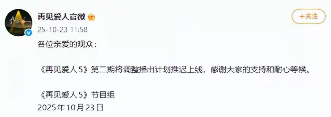 《再见爱人5》本来今天应该播第二期的,但官微在播出前2分钟发文表示第二期节目将要延期播出。