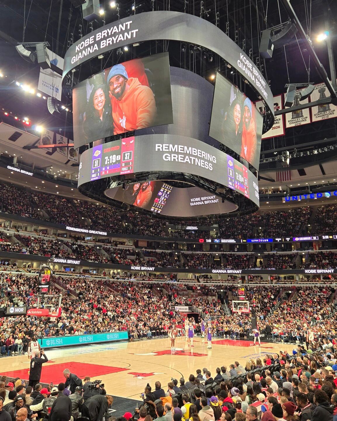 公牛主场大屏幕晒出科比和Gigi两人照片并写道:缅怀伟大。像是在见证新一代湖人球员如何接过火炬,继续前行。