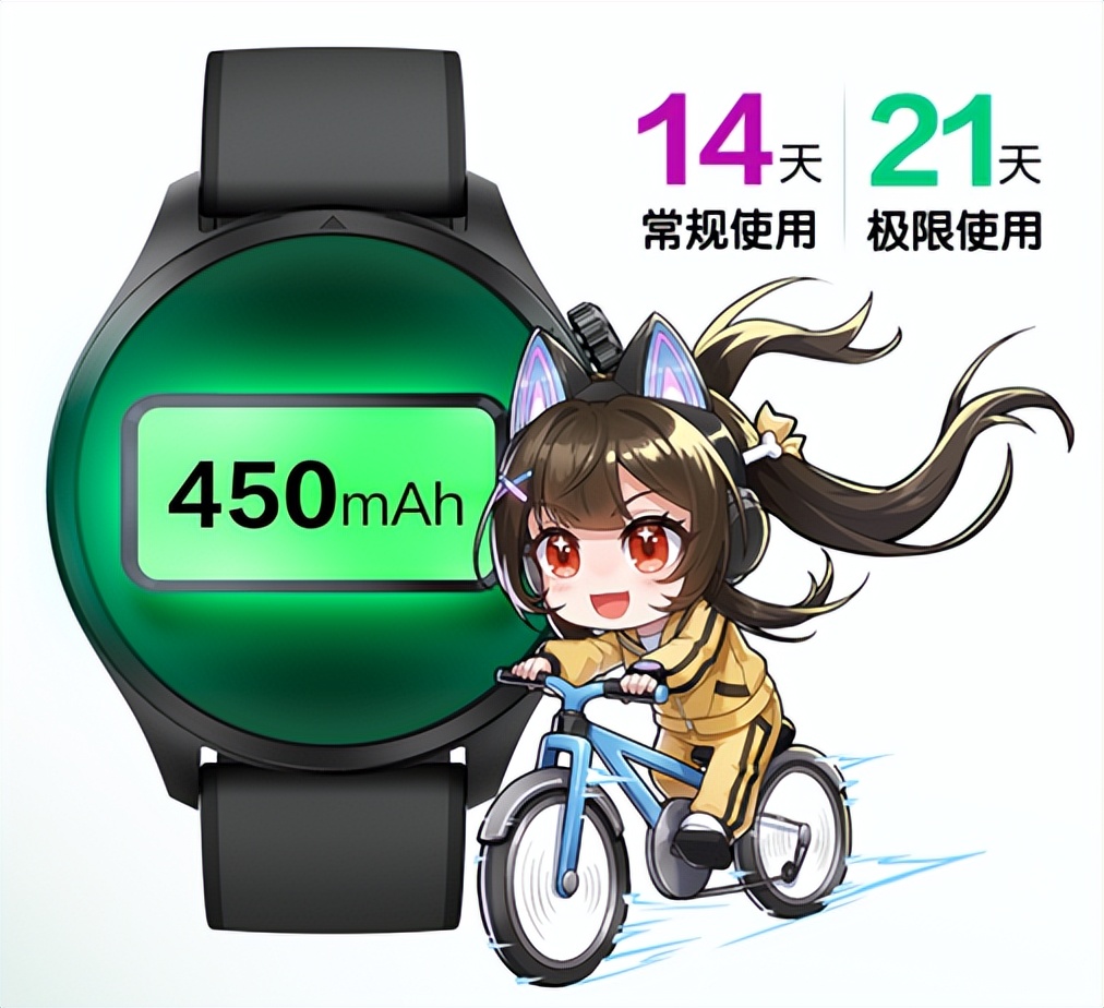 l 悦心G1搭载450mAh大容量电池,在开启AOD、动态表盘,且用户经常运动的情况下续航可达一周;关闭AOD、使用静态表盘,用户偶尔运动的情况下续航可达14天,开启省电模式的极限使用场景下续航更是可达21天。