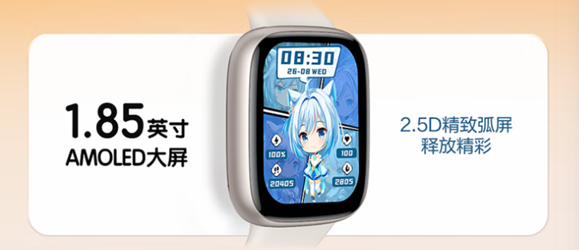 线条简洁明快,个性化表盘市场任你搭配,是为年轻一代量身打造的科技配饰。配备 1.85 英寸超大 AMOLED 屏幕,搭配 2.5D 弧面玻璃设计,触感圆润无割手感,同时实现超高屏占比,带来沉浸式视觉体验。多款多巴胺色系颜色,从黑巧脆珠到桃桃气泡,满足年轻用户对个性化搭配的需求,轻松点亮每日穿搭。