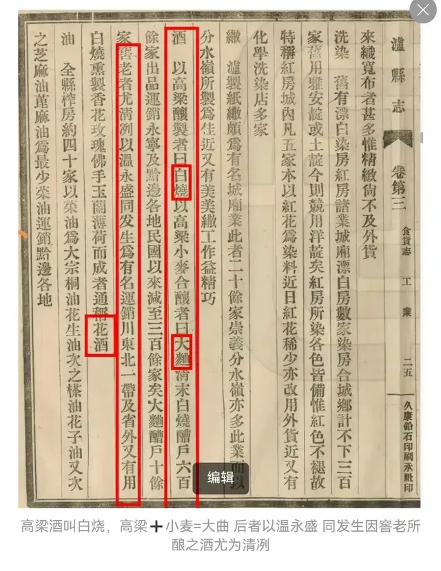 1.白酒生产高粱酒:以高粱为主要原料酿制,被称为“白烧”。其中一些著名的产品包括“大麯”,这是以高粱和小麦混合酿制的酒。大麯醋户:在清末有六百余户从事大麯醋的酿造,但到了民国时期减少至三百余户。名酒:如“温永盛同发生”等,这些品牌在当时非常有名,产品远销川、重庆、北方等地以及省外地区。2.白酒消费消费群体:主要是本地居民以及周边地区的消费者。随着市场需求的变化,白酒的消费逐渐扩大到更广泛的区域。用途:除了日常饮用外,白酒还用于祭祀、庆祝节日等活动。例如,在某些传统节日或庆典中,人们会准备白酒作为祭品或招待宾客。3.白酒产业发展行业变化:民国以来,由于税捐繁重等原因,白酒产业经历了较大的波动。尽管如此,部分知名品牌的生产和销售依然保持良好势头。市场竞争:随着外来商品的涌入,本地白酒面临着一定的竞争压力,但因其独特的风味和品质,仍然占据了一定的市场份额。4.相关法规和政策税收政策:在清代,白酒产业需要缴纳多种税项,如正税、杂税等。到了民国时期,税制有所调整,但仍存在较为复杂的税收结构。管理机构:清末设立了专门的机构来管理和监督白酒产业的发展,如盐运使署等,民国时期则改为由地方政府或相关部门负责管理。5.酿酒技术传统工艺:采用了传统的酿造方法,注重原材料的选择和发酵过程的控制,保证了白酒的独特风味。改进和发展:虽然总体上保持了传统工艺,但在民国时期也出现了一些技术上的改进,例如引入新的设备和技术以提高产量和质量。6.文化意义地方特色:白酒不仅是饮品,更是地方文化的象征。它反映了当地的历史、风俗和社会经济状况。传统习俗:在许多传统习俗中,白酒扮演了重要角色,如婚礼、葬礼、祭祀等场合都会使用白酒。7.品牌和声誉知名品牌:如“温永盛同发生”等品牌在当时享有较高声誉,产品远销多地。质量评价:优质白酒受到广泛好评,尤其是那些历史悠久、传承下来的酿造工艺生产的白酒,被认为具有更高的品质和收藏价值。《泸县志》记载显示,泸县的白酒产业有着深厚的历史底蕴和重要的经济地位,尽管面临诸多挑战,但通过不断的技术改进和市场适应,仍然保持了一定的竞争力和文化影响力。