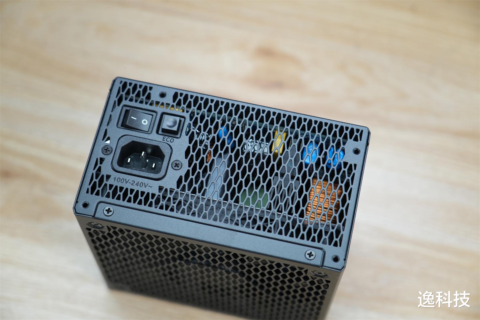 电源背面除电源接口和开关外,还有ECO模式开关。此开关可切换ECO和AUTO两种散热模式:开启ECO开关为ECO模式,风扇在负载小于45时停转,随温度和负载升高自动启动;关闭ECO开关进入AUTO模式,电源实时监测负载并智能调节风扇转速,高负载时加速散热,低负载时低速运转。