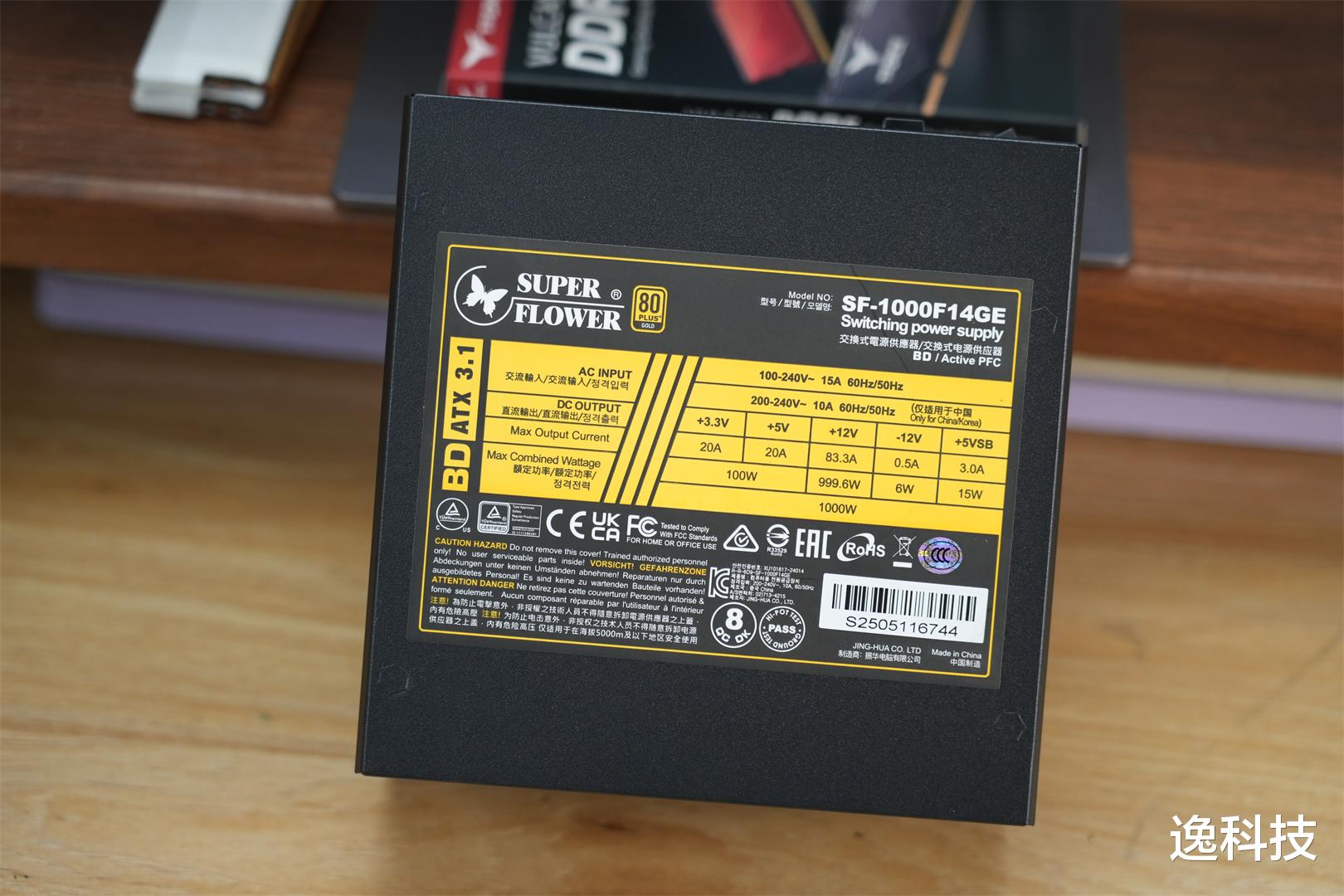 电源背面贴纸标注着电源规格信息:+12V的额定输出电流达83.3A,最大输出功率为999.6W,能轻松满足9950X3D搭配RTX5090满负荷运行时的供电需求;+5V和+3.3V的额定输出电流均为20A,二者联合输出功率为100W,为主板、内存、USB接口、ARGB灯等非核心部件供电毫无压力。