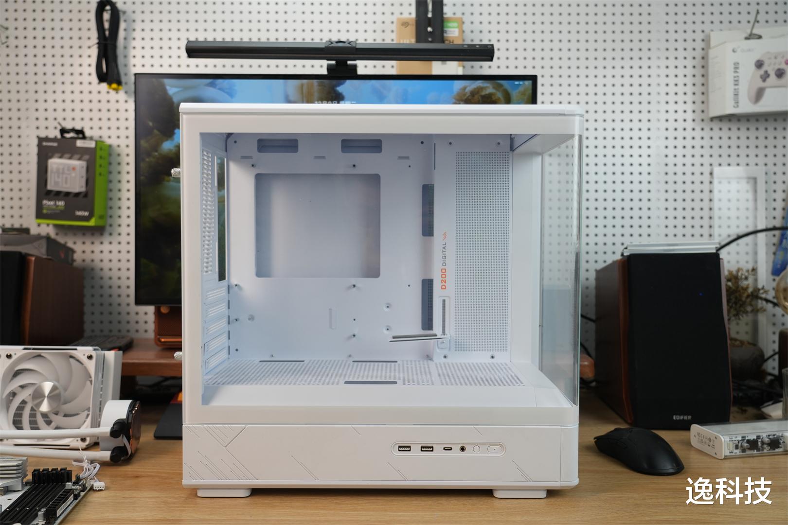 乔思伯D200系列在外观选择上十分贴心,提供了黑色与白色两种款式供用户挑选。它的整体尺寸为437 x 216 x 419 mm,大小适中。机箱采用一体曲面折弯玻璃,搭配上下分仓的巧妙设计,还加入了数显屏用于温度监控。值得一提的是,其前面板没有立柱,能为使用者带来270°的开阔宽广视野。