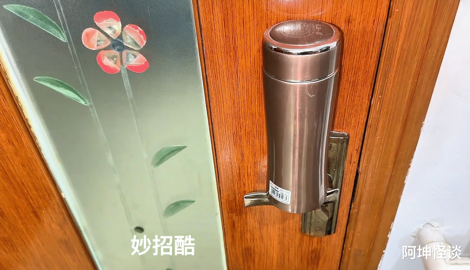 为什么要放一个杯子呢?好多人还不懂。只要别人想进到屋内,就要开门按动门把手,按动门把手的同时,杯子就会掉到地上。