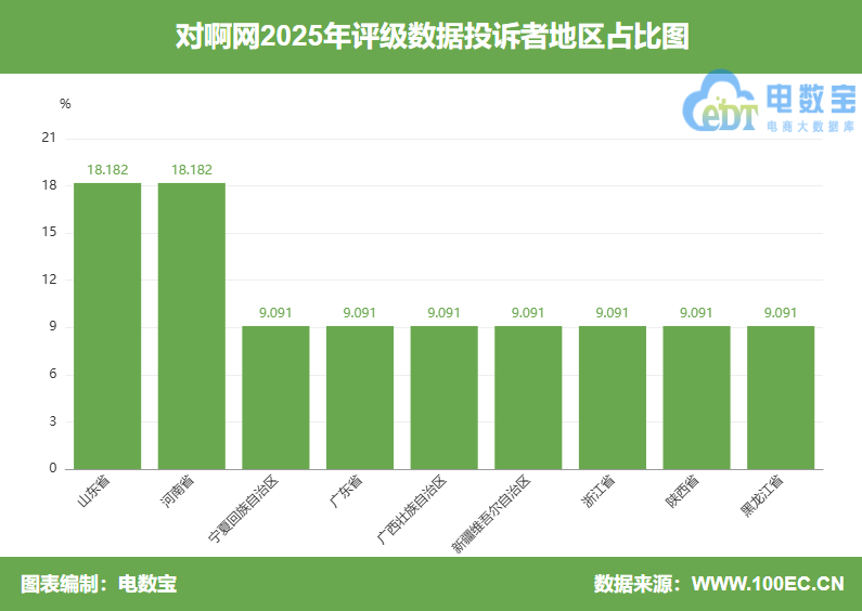 根据网经社旗下电商大数据库“电数宝”显示,2025年投诉“对啊网”的用户主要集中地区为山东省(18.182%)、河南省(18.182%)、宁夏回族自治区(9.091%),其于分别为:广东省、浙江省、陕西省、黑龙江省等。