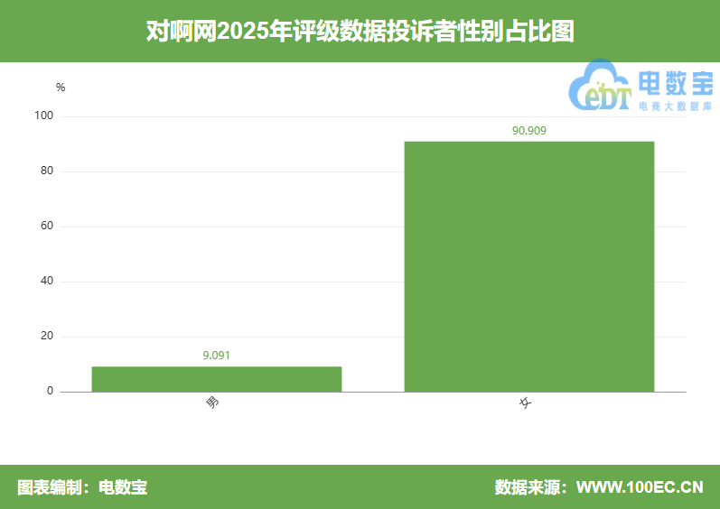 根据网经社旗下电商大数据库“电数宝”显示,投诉“对啊网”男性用户投诉比例为9.091%,女性用户投诉比例为90.909%。