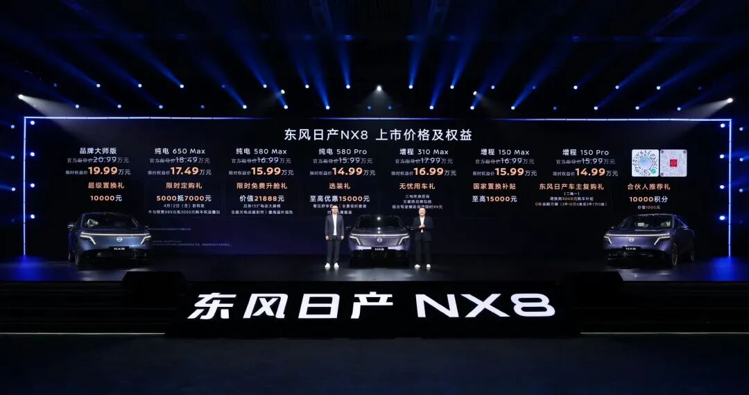 4月8日上市的NX8,直接以14.99万元的价格起售,整体竞争力相当强。这车价格定的非常实诚,对比配置等来看,属于实惠的过日子舒适车。不仅是价格,空间大,配置高。该车在15万的价格上就给了激光雷达、momenta辅助驾驶、宁德时代电池、800V平台和5C充电,并且实现了增程和纯电同价。所以,NX8订单也爆了,东风日产高管在现场说,该车1小时订单为8432个订单,表现相当不错。
