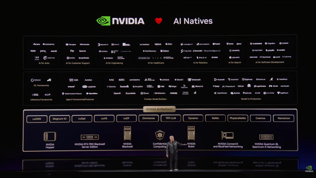 NVIDIA作为一家算法公司,凭借广泛的市场触达和庞大的装机量,通过持续优化算法不断降低计算成本,为大家扩大规模并提升速度。NVIDIA构建了加速计算平台并提供RTX、cuDF、cuVS等一系列库,最终将其集成到全球的云服务和OEM厂商中触达全球。这种合作模式正在Google Cloud、Snapchat等平台上不断重复。我们为在JAX、XLA和PyTorch上所做的出色工作感到自豪。我们是全球唯一在这些框架上都表现卓越的加速器。像Baseten、CrowdStrike、Puma、Salesforce等不仅是我们的客户也是开发者。