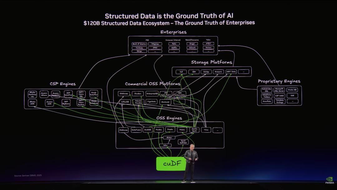 接下来我们要详细探讨结构化数据。大家熟知的SQL、Spark、Pandas、Velox以及Snowflake、Databricks、Amazon EMR、Azure Fabric、Google Cloud BigQuery等超大型平台都在处理数据框。这些数据框是巨大的电子表格,保存着企业计算和业务的单一真值。过去我们努力加速结构化数据处理,以更低成本和更高频率让公司高效运行。未来AI将以极快的速度使用这些结构化数据库。除此之外,还有代表全球绝大部分信息的非结构化生成式数据库,如向量数据库、PDF、视频和演讲等。每年生成的90%的数据都是非结构化数据。直到现在由于缺乏简便的索引方式且难以理解其含义,这些数据一直无法被高效查询和搜索。
