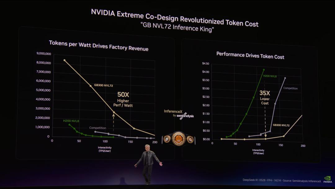 推理速度决定了响应速度,也就是单次推理的交互性。推理速度越快,能处理的上下文和思考的Token就越多,这等同于AI的智能程度和吞吐量。AI越聪明,思考时间变长,吞吐量就会随之降低。从现在起,全世界的每一位CEO都会将业务视作Token工厂并将其直接与收入挂钩。在给定功率下,更好的每瓦性能意味着更高的吞吐量和更多的Token产出。NVIDIA拥有全球最高的性能,摩尔定律原本预期带来1.5倍的提升,但我们实现了35倍的跨越。