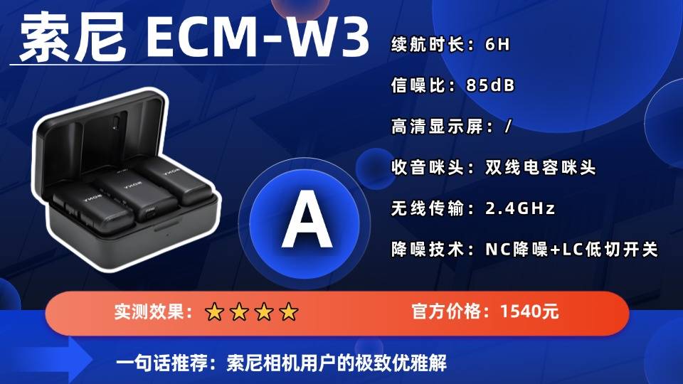 索尼ECM-W3是一款采用经典物理降噪方案的无线麦克风,其NC降噪+LC低切开关的双重设计为用户提供了直观且可靠的声音控制。用户可根据环境手动开启降噪以过滤背景噪音,或启动低切来消除风声和空调嗡鸣等低频干扰,这种直接的控制逻辑深受传统音频工作者的青睐。音质上,它支持48kHz/24Bit高清录音,85dB的信噪比和115dB的最大声压级共同保障了声音的清晰度与动态范围。无线传输距离为150米,支持一拖二,机身仅重17克。然而,其6小时的单体续航时间,在需要长时间户外作业时,可能成为制约连续创作的瓶颈。
