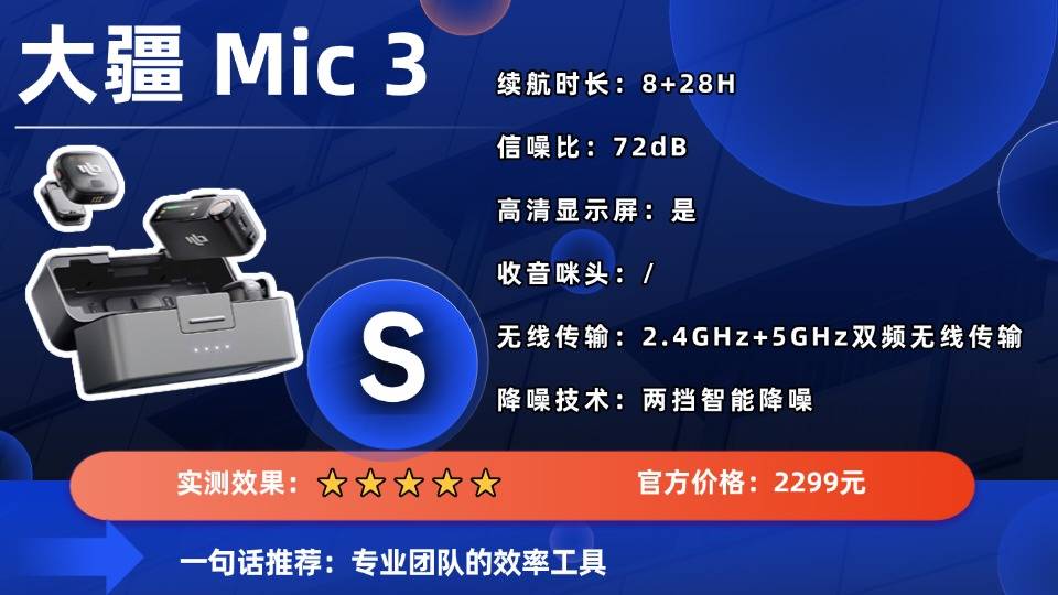 大疆Mic 3作为无线麦克风领域的旗舰新作,其核心技术突破在于首次引入了2.4GHz+5GHz双频无线传输。这项技术能智能切换频段,在复杂无线环境中提供前所未有的连接稳定性和抗干扰能力,将可靠传输距离拓展至400米。音质方面,它支持48kHz/24bit的高清录音,并创新性地在发射端内置了双文件32-bit浮点内录功能,相当于为音频上了一道“双保险”,彻底杜绝因信号干扰导致的音频丢失。此外,其两档智能降噪能灵活应对不同环境,360°全向收音确保拾音无死角。整机设计极致轻巧,发射器仅重16克。综合续航达28小时,并配备高清显示屏。缺点是其定价高端,对于入门级用户而言投资门槛较高。