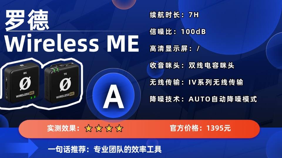 罗德Wireless ME是一款定位于专业人声收录的紧凑型无线麦克风系统。它继承了罗德在专业音频领域的技术基因,采用稳定可靠的 IV系列无线传输方案,提供约100米的有效工作距离。其音质表现堪称核心亮点,拥有100dB的极高信噪比,能呈现异常纯净、底噪几乎不可闻的人声;同时,122dB的最大声压级确保了即使面对突然的高音量冲击,也能有效避免失真。麦克风采用全指向性设计的双线电容咪头,收录声音自然。此外,它提供了AUTO自动降噪与DYNAMIC动态降噪两种模式,兼顾便捷与手动控制。机身重量为32克,结构扎实。但是,其7小时的单体续航时间,在需要进行全天候户外拍摄时,可能需要携带充电宝或准备备用电池。