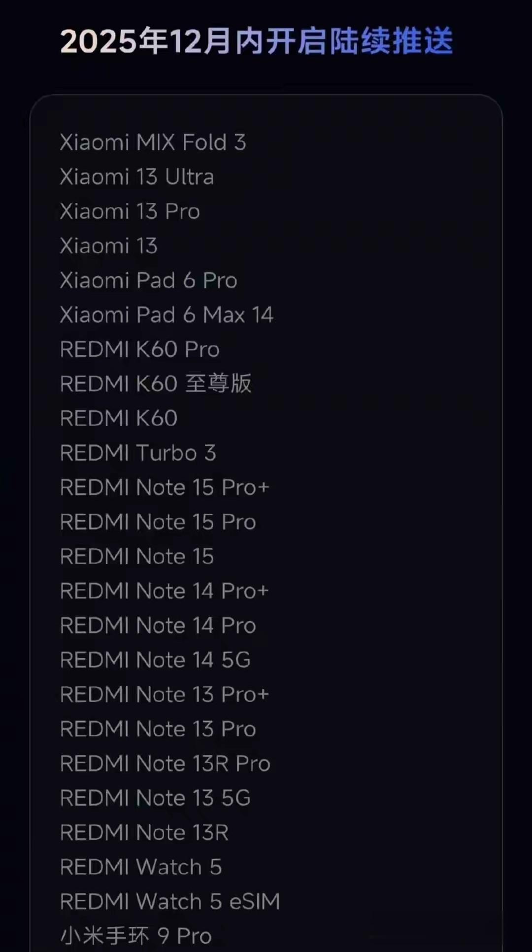 其实整个更新是分阶段的。眼下到明年3月算第三阶段,会把更早的旗舰机也拉进来——小米12、13系列,还有Redmi K60、Note 15这些都在名单里。不过官方特意提醒,实际测试要是发现问题,适配清单可能会微调,大家多留意系统更新提示就行。