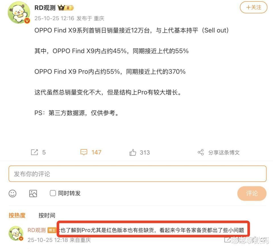 首销当天,OPPO Find X9系列便迅速引爆市场,全国多地门店排起长队,多款热门机型很快进入缺货状态,社交平台上加价“求购追光红”的呼声不断,尤为亮眼的是,OPPO Find X9 Pro销量占比远超前代,据RD观测提供的数据,Pro版占比接近60%,同期接近上代的370%。