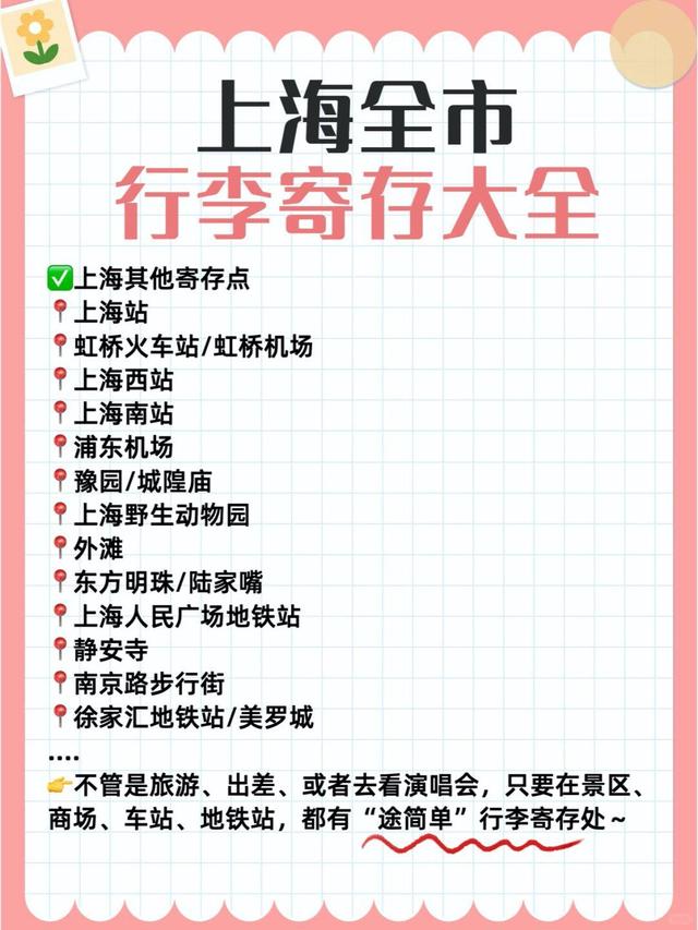 ✅“途简单”上海其他寄存点•上海站•虹桥火车站/虹桥机场•上海西站•上海南站•浦东机场•豫园/城隍庙•上海野生动物园•外滩•东方明珠/陆家嘴•上海人民广场地铁站•静安寺•南京路步行街•徐家汇地铁站/美罗城....共170多个寄存点不管是旅游、出差、或者去看演唱会,只要在景区、商场、车站、地铁站,都有“途简单”行李寄存处。