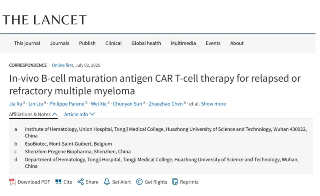 2025年7月,华中科技大学同济医学院附属协和医院的一项突破性研究成果登上国际顶级医学期刊《柳叶刀》,宣布全球首次成功应用体内CAR-T疗法治疗多发性骨髓瘤患者,4名接受治疗的复发难治患者全部获得缓解,其中两人甚至实现了严格意义上的完全缓解。
