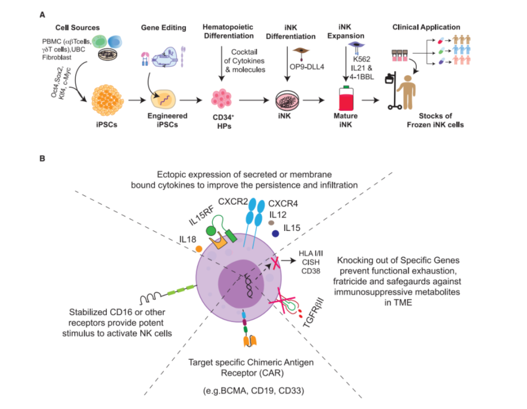 科学家通过基因编辑技术(如CAR工程、IL-15通路调控)和定向分化技术,制造出功能增强的iPSC-NK细胞。这些“超级NK细胞”具有多种优势: