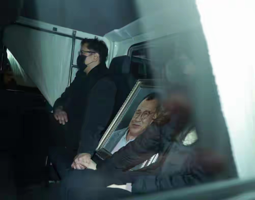许绍雄的女儿许惠菁手捧父亲遗照登上灵车,神情哀伤。
