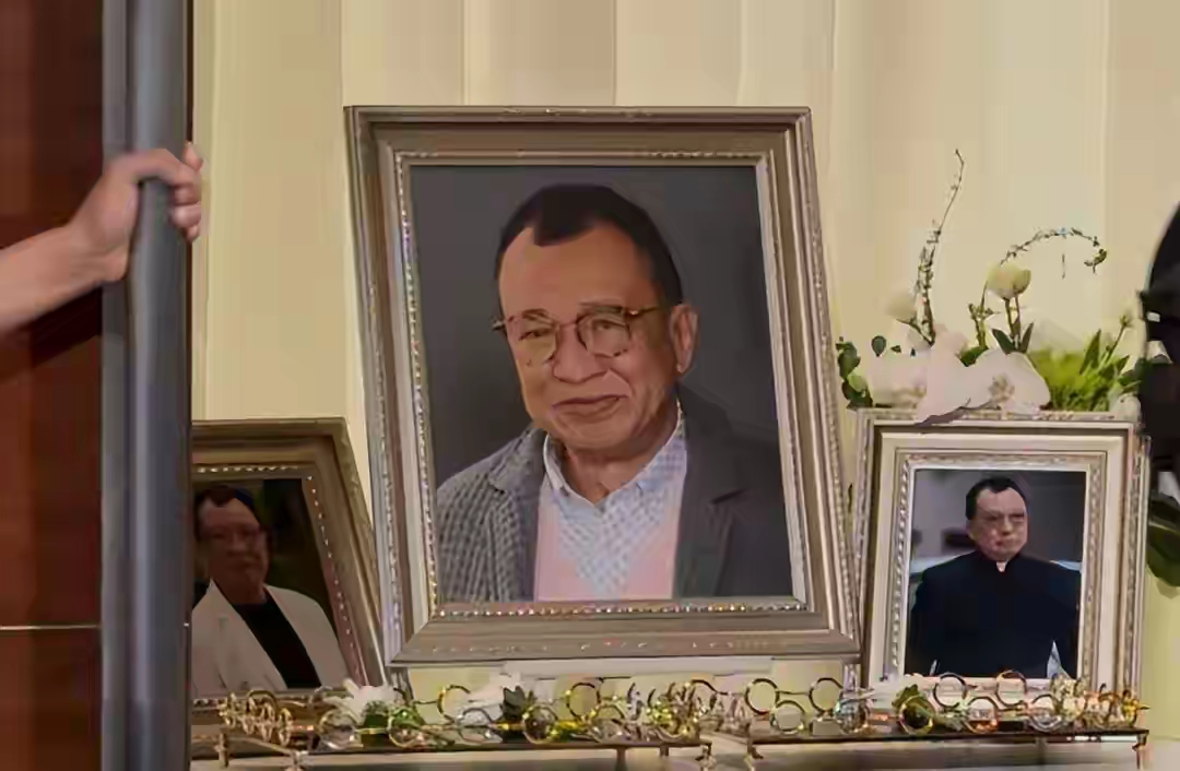 灵堂中央悬挂着他面露慈祥笑容的遗照,两侧摆放着他生前经典角色剧照,其中就有《使徒行者》中那个让人难忘的“欢喜哥”。