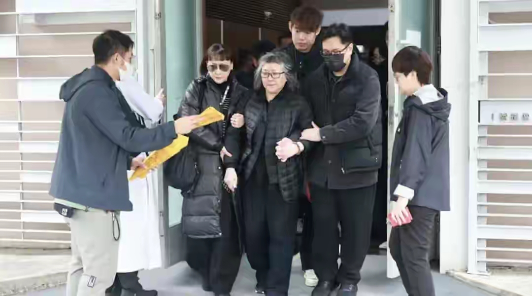 而许绍雄的遗孀龙嬿则由女婿及契女佘诗曼搀扶,紧随在后。