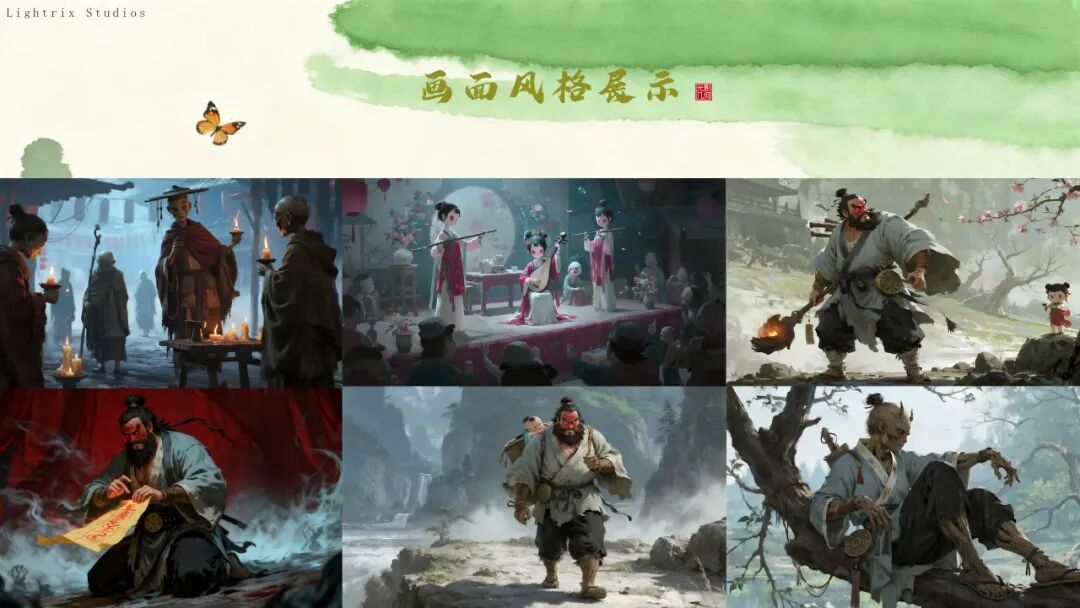 表现手法也不仅仅局限在“水墨”一种,他们更倾向于在国风大前提下多维延伸触角,比如后续作品尝试游戏CG风格等,或许能做一个与众不同的“AI国漫宇宙”。