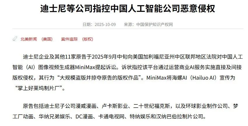 9月17日,迪士尼、康卡斯特旗下环球影业与华纳兄弟探索在加州联邦地方法院共同起诉,指控中国人工智能公司MiniMax旗下的海螺AI服务严重侵犯版权。