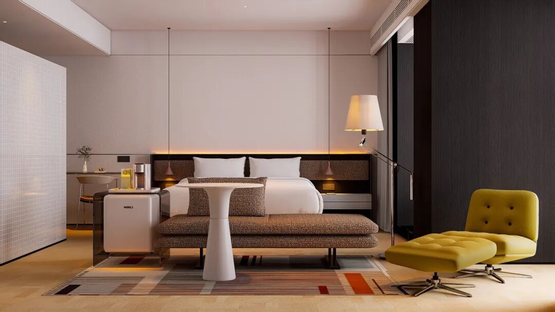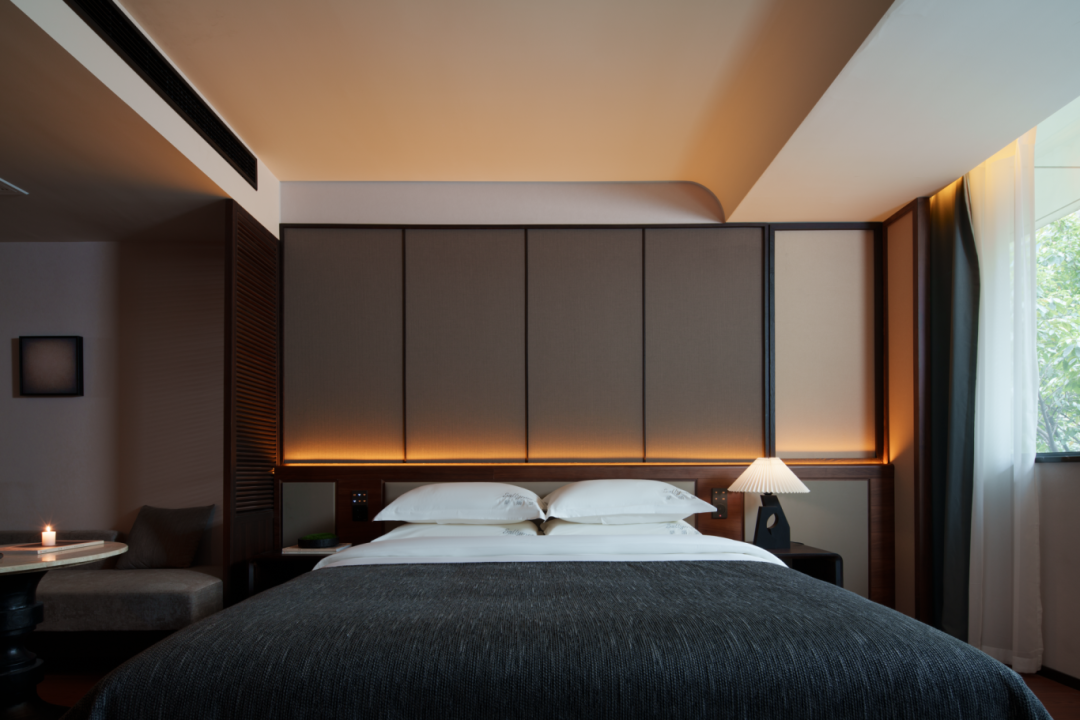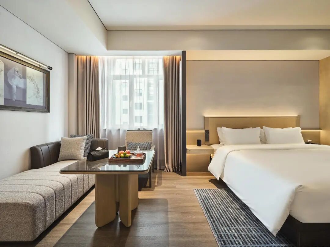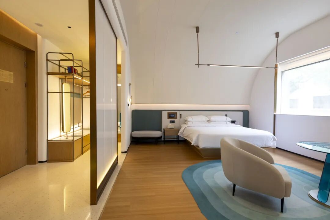 酒店由知名设计师倾力打造,以“法式优雅”为空间底色,揉入现代智能科技,拒绝千篇一律的酒店模板:整体空间弥漫着法式慵懒质感,柔缓的线条、温润的色调搭配精致软装,瞬间消解城市奔波的疲惫,营造出 “在家般松弛,却更具格调” 的旅居氛围。