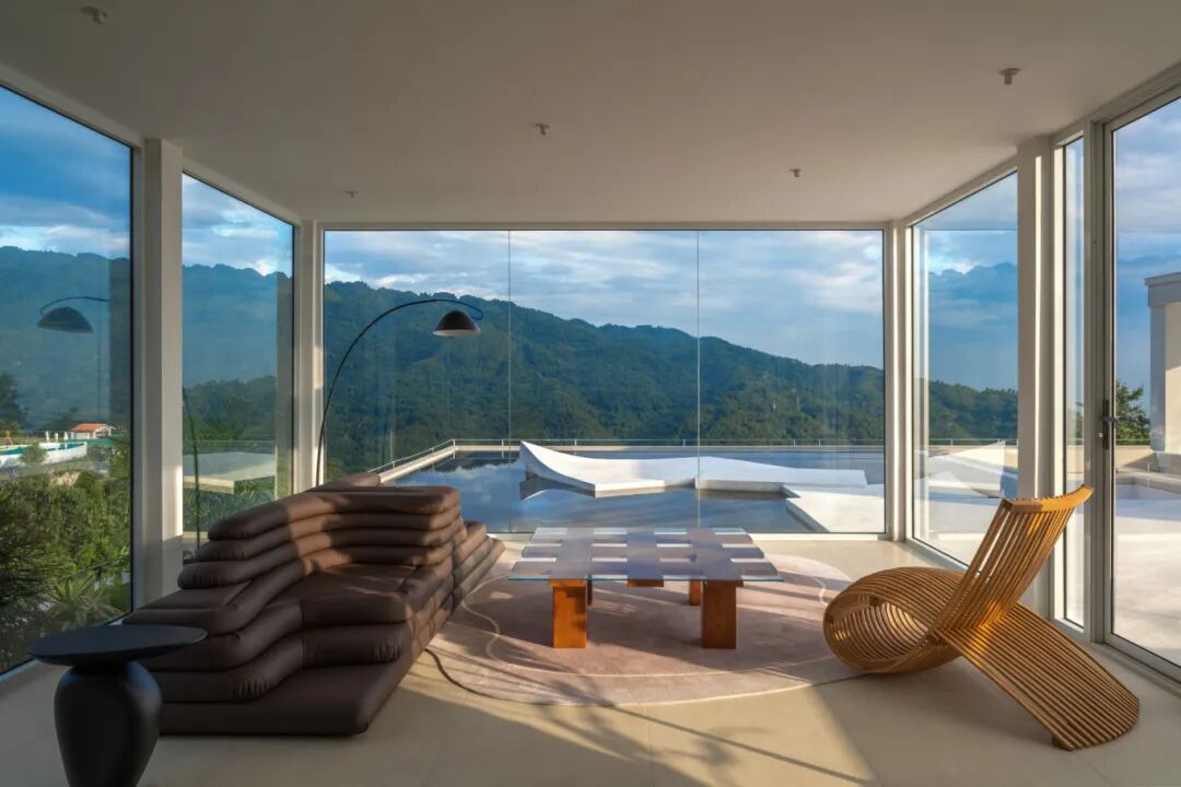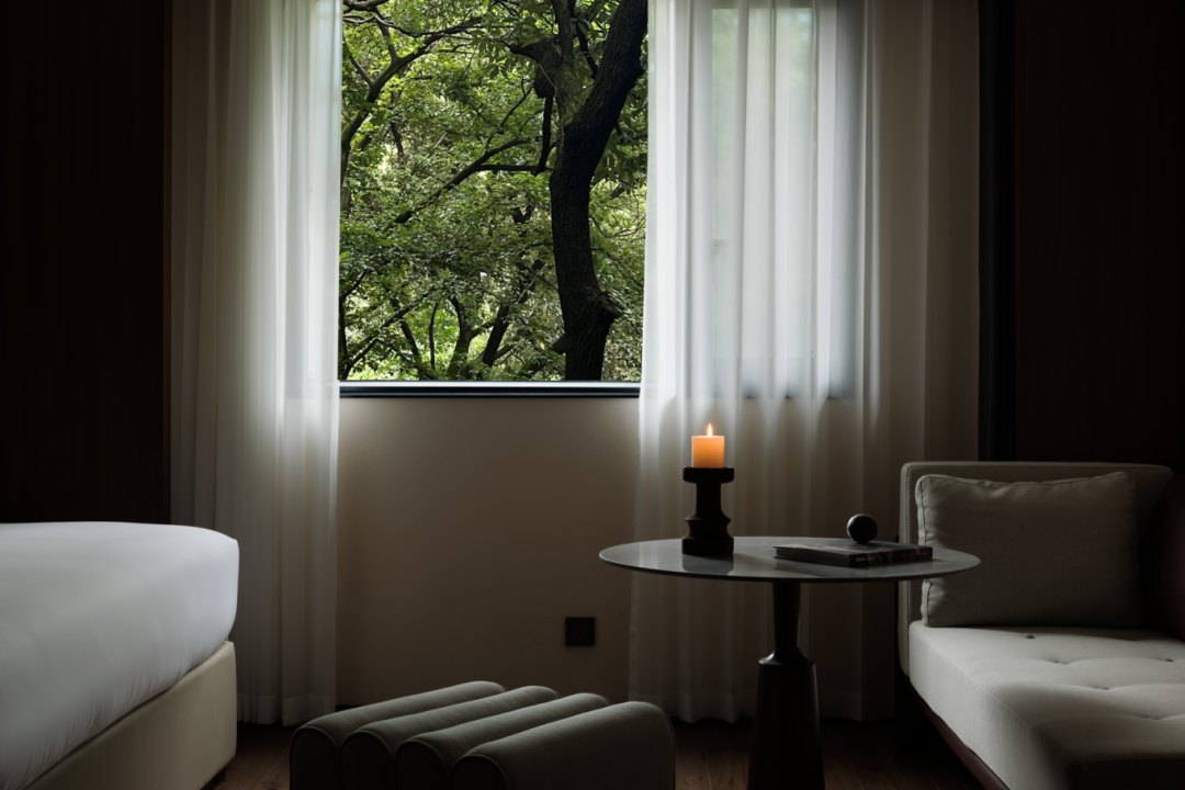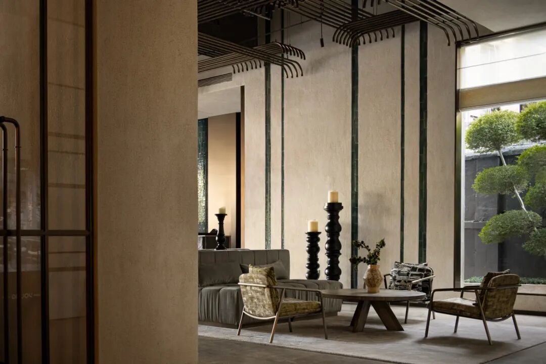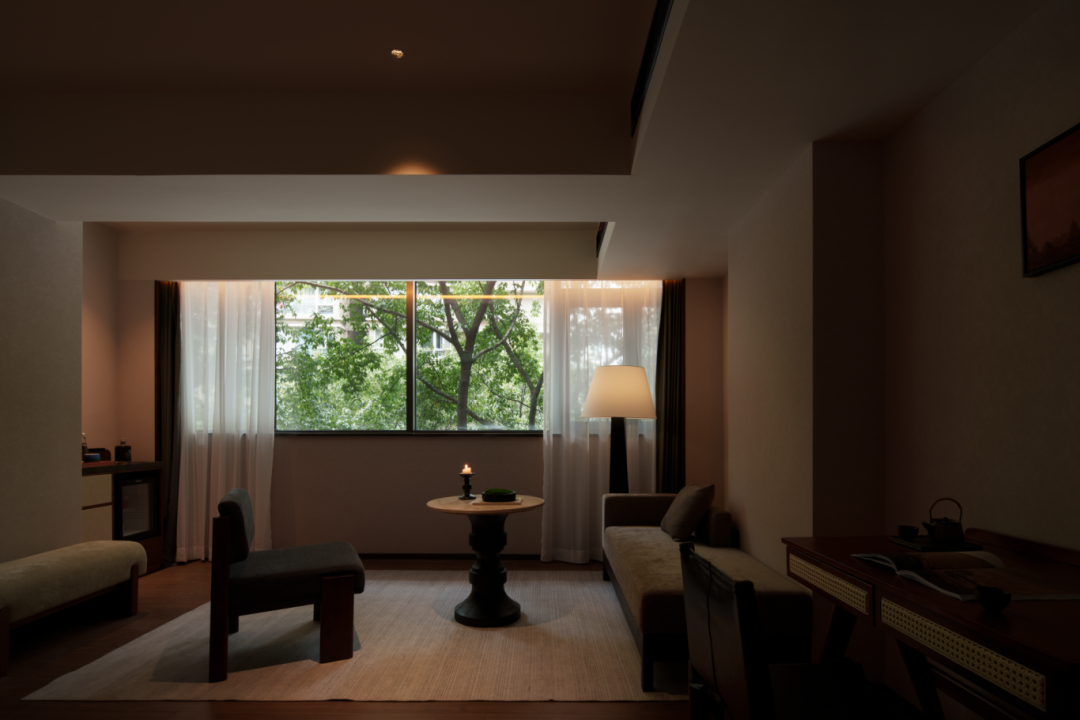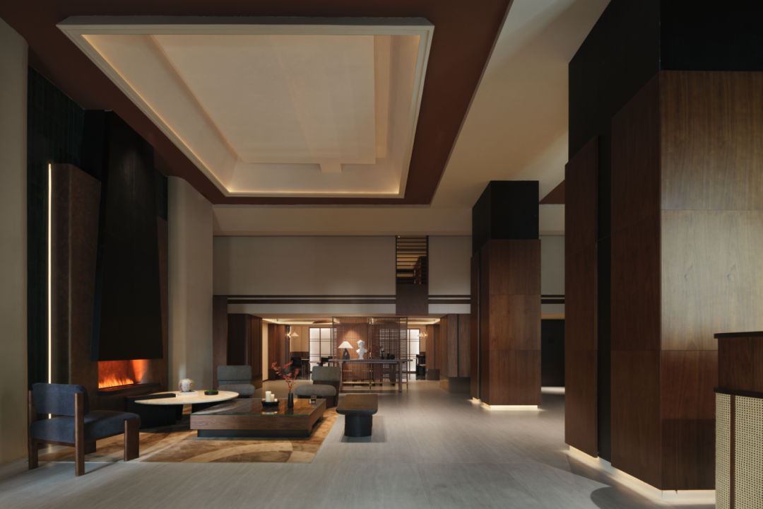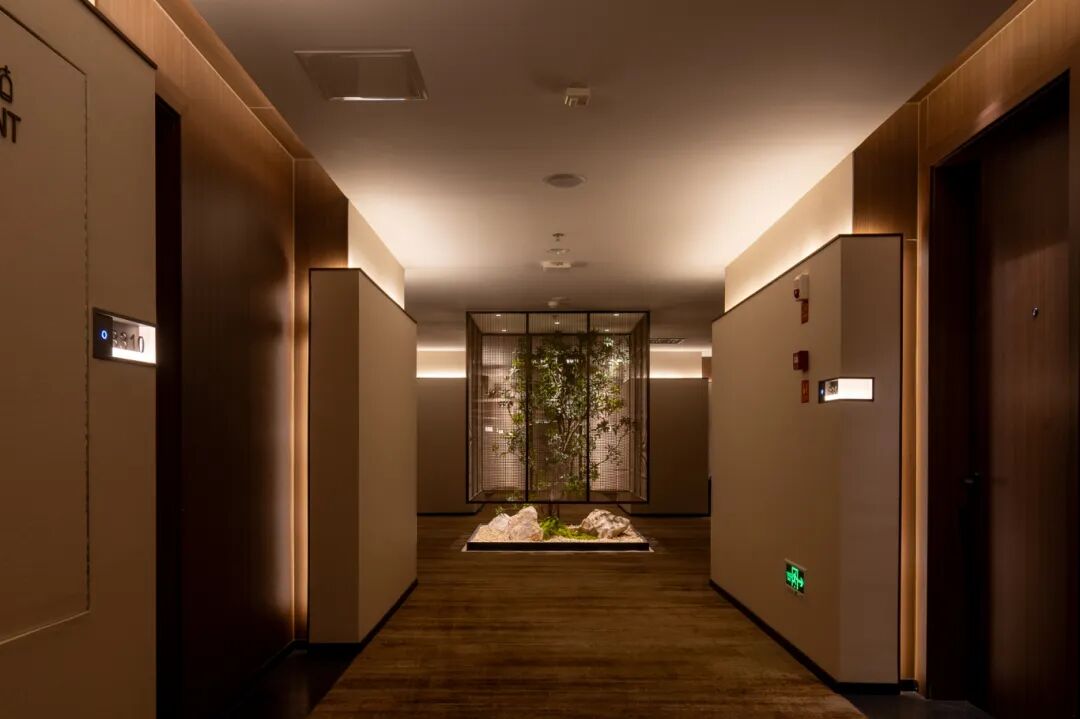 这个主题融合了避世的宁静、心灵的栖所与无拘的洒脱。 酒店入口低调而神秘,幽深的窄廊。这个过程是一个“净化”仪式,让客人一步步脱离外部世界的喧嚣。入住办理位于顶层,客人抵达后视野豁然开朗。酒店各个角落设置多种“独处”空间——临窗的阅读角、面朝山谷的大窗、或是倚靠天井下的沙发,赋予“无所事事”以最高价值。