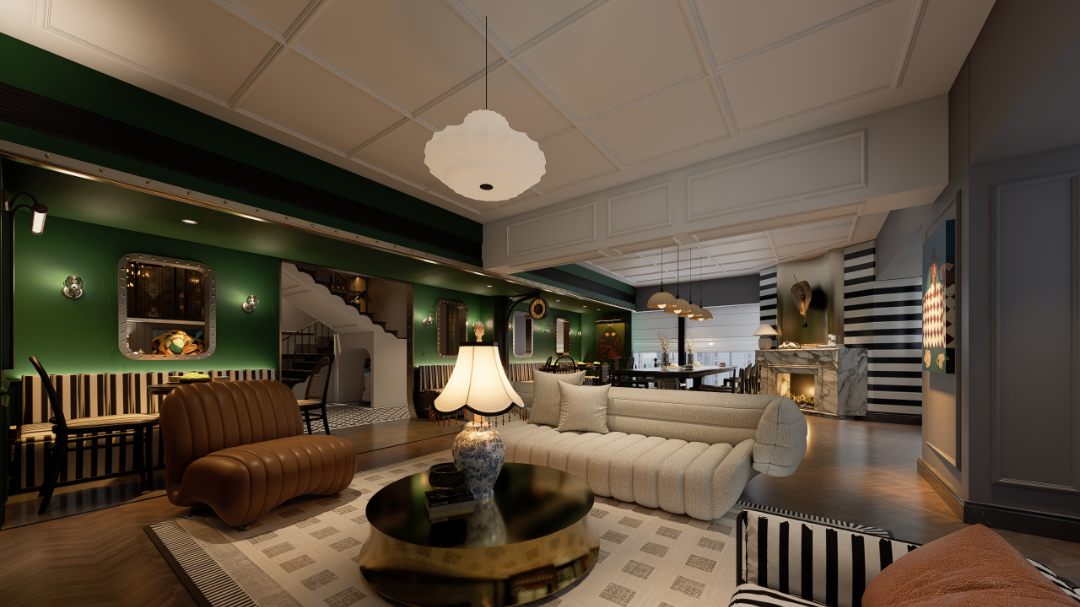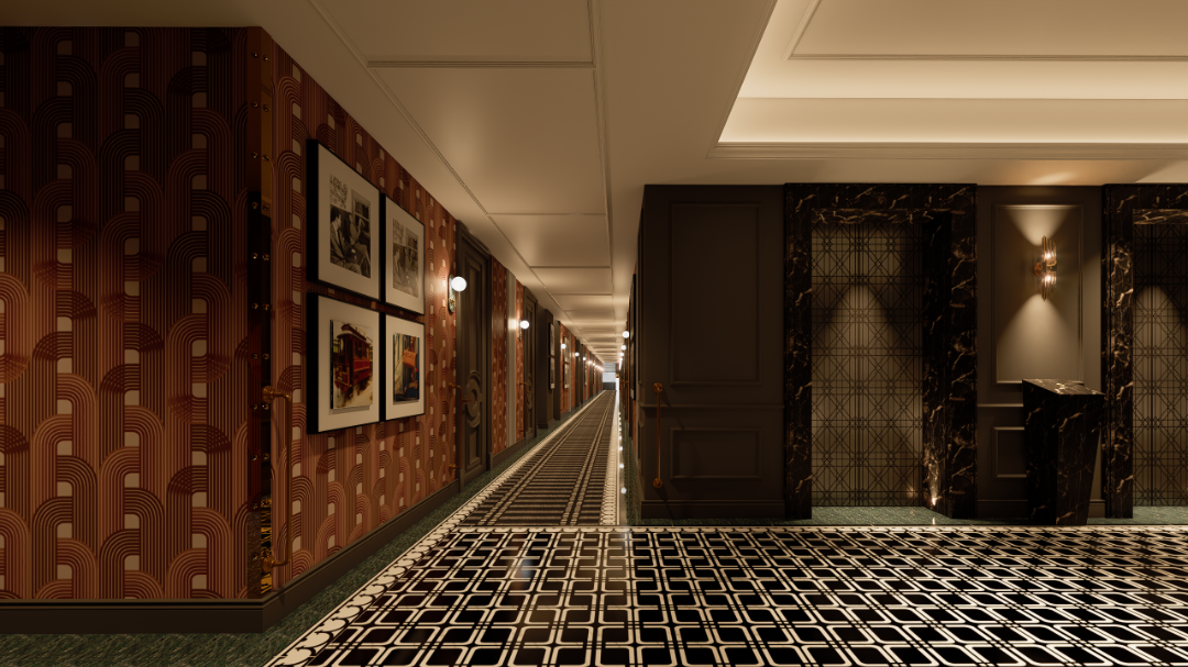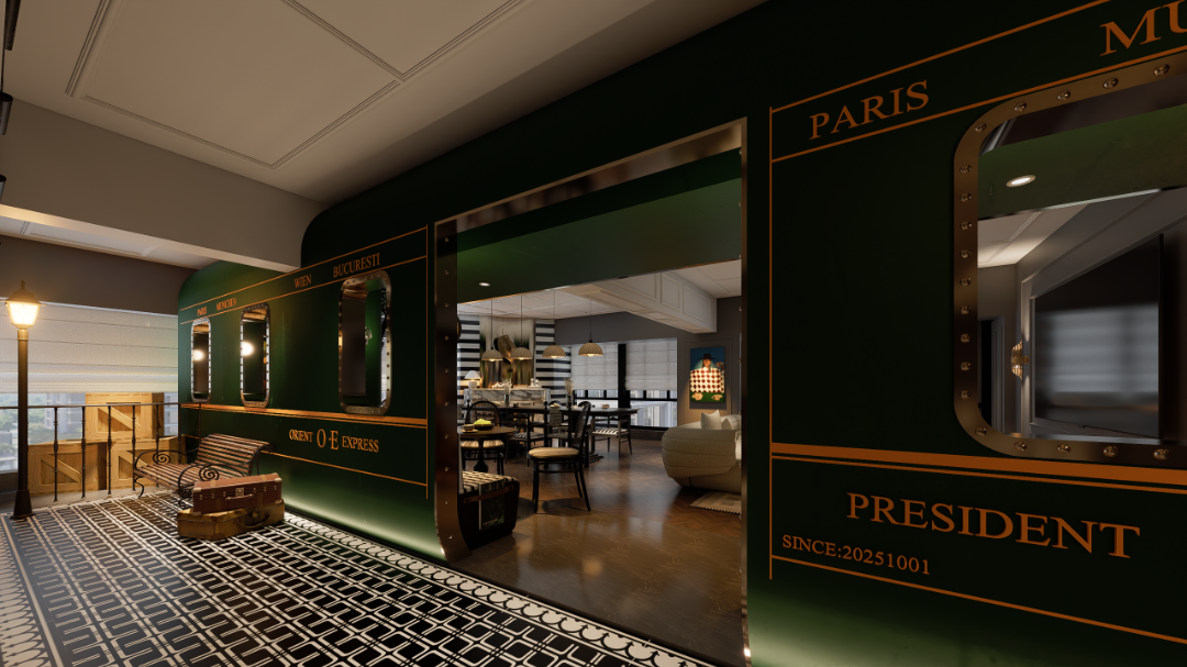 酒店锚定复古基因与包豪斯精神的融合,以 “回溯经典,重构现代” 为脉络。包豪斯的 “功能理性” 与复古风格的 “情感温度” 碰撞,摒弃纯形式复刻,将包豪斯强调的几何秩序、材质本真,与复古美学中的经典纹理(千鸟格、人字拼)、色彩记忆(勃艮第红、大地棕)结合,让空间既保有工业时代的理性骨架,又充盈时光沉淀的人文质感,构建独特的 “新复古包豪斯” 语境。