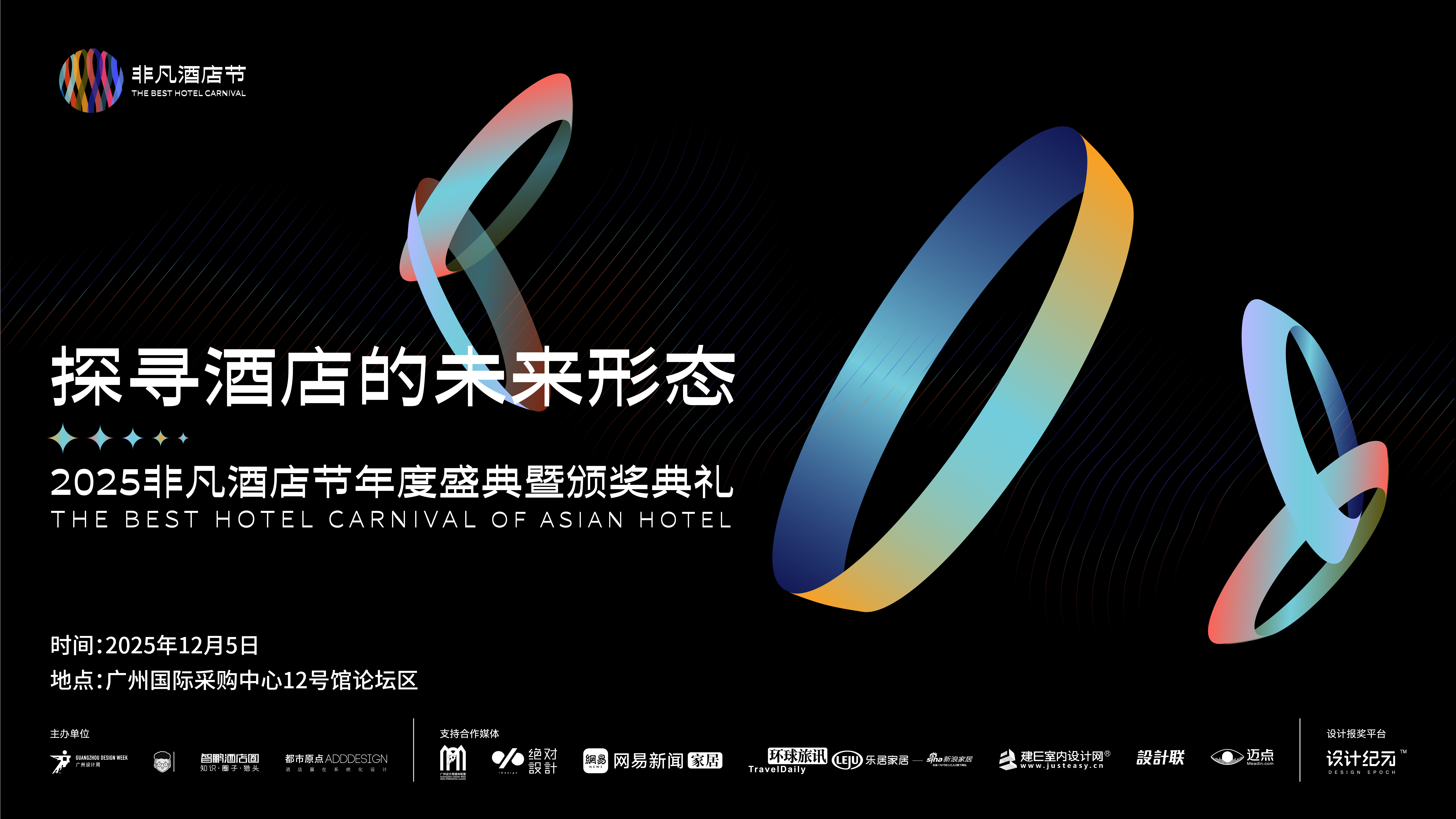 2025非凡酒店节(THE BEST HOTEL CARNIVAL)是由广州设计周、智鹏酒店圈、ADD都市原点设计机构联合发起,作为酒店业的年度盛事,非凡酒店节将结合酒店运营、空间设计和客户体验,多维度出发,为投资人、酒店经营者以及新生代消费者精选年度杰出的酒店品牌、杰出酒店设计机构、杰出酒店人物。