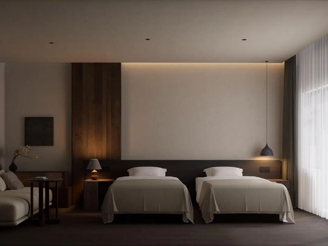 本酒店以“光”为笔,“影”为墨,重塑空间感知。建筑上,巧妙开窗引天光入室,随时间流转,形成动态的光影壁画。公共区域,运用镂空隔断、玻璃砖墙,营造丰富的光影层次与通透感。客房内,摒弃主灯,采用智能调光系统与隐藏式灯带,可随心切换多种情境模式,从晨曦的活力到黄昏的暖融。艺术装置贯穿始终,利用投影与镜面创造互动光影艺术,让住客沉浸于一场随时间流动的光影戏剧,于昼夜交替间,感悟空间的诗意与静谧。
