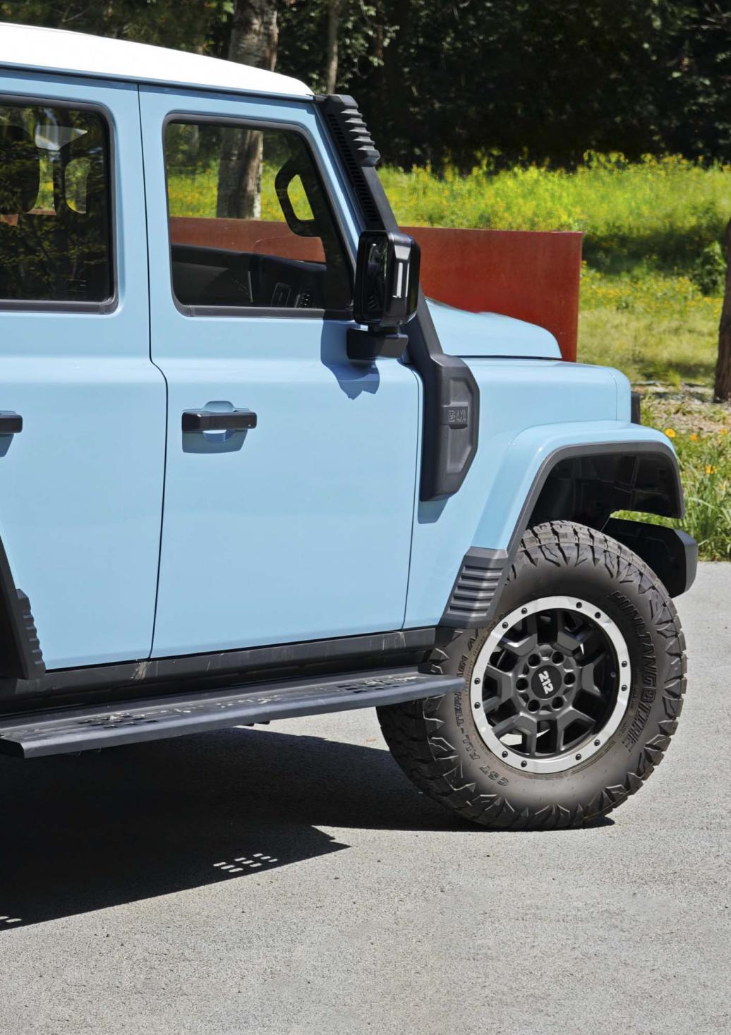 先说外观吧,这车开在路上,回头率是真的高。清风蓝车身配色,搭配白色车顶,车头那对圆灯是经典设计,亮起来的时候里面的十字日行灯挺有神。侧面看线条很直,从车头一直贯穿到车尾,整体显得方正、挺拔。