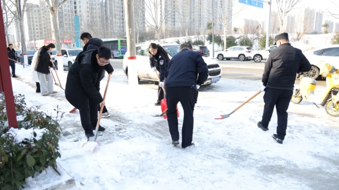 寒风凛冽,冰雪凝路,但院外却是一派热火朝天的劳动景象。此次清扫主要针对院外周边非机动车道、人行通道、公交站牌等,做到清雪无死角、除冰全覆盖。干警们手持铁锹、扫帚等工具,分工协作、默契配合,有的奋力铲除路面坚冰,有的仔细清扫残余积雪,有的合力将积雪清运至指定区域。尽管寒气袭人,大家的手脚冻得通红,哈出的白气在冷风中四散,但每个人都干劲十足、热情高涨,一条条干净通畅的道路也被及时开辟出来。