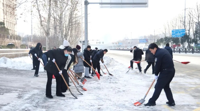 近日,信阳地区迎来降温降雪天气,道路积雪结冰,给群众出行和诉讼来访办事带来诸多不便。为切实消除安全隐患,保障诉讼群众及过往行人出行安全,今天上午,信阳中院“天平”志愿服务队百余名党员干警响应市“清冰除雪”倡议,迅速集结开展铲雪除冰行动,用实干与担当在风雪中筑起一道暖心防线。