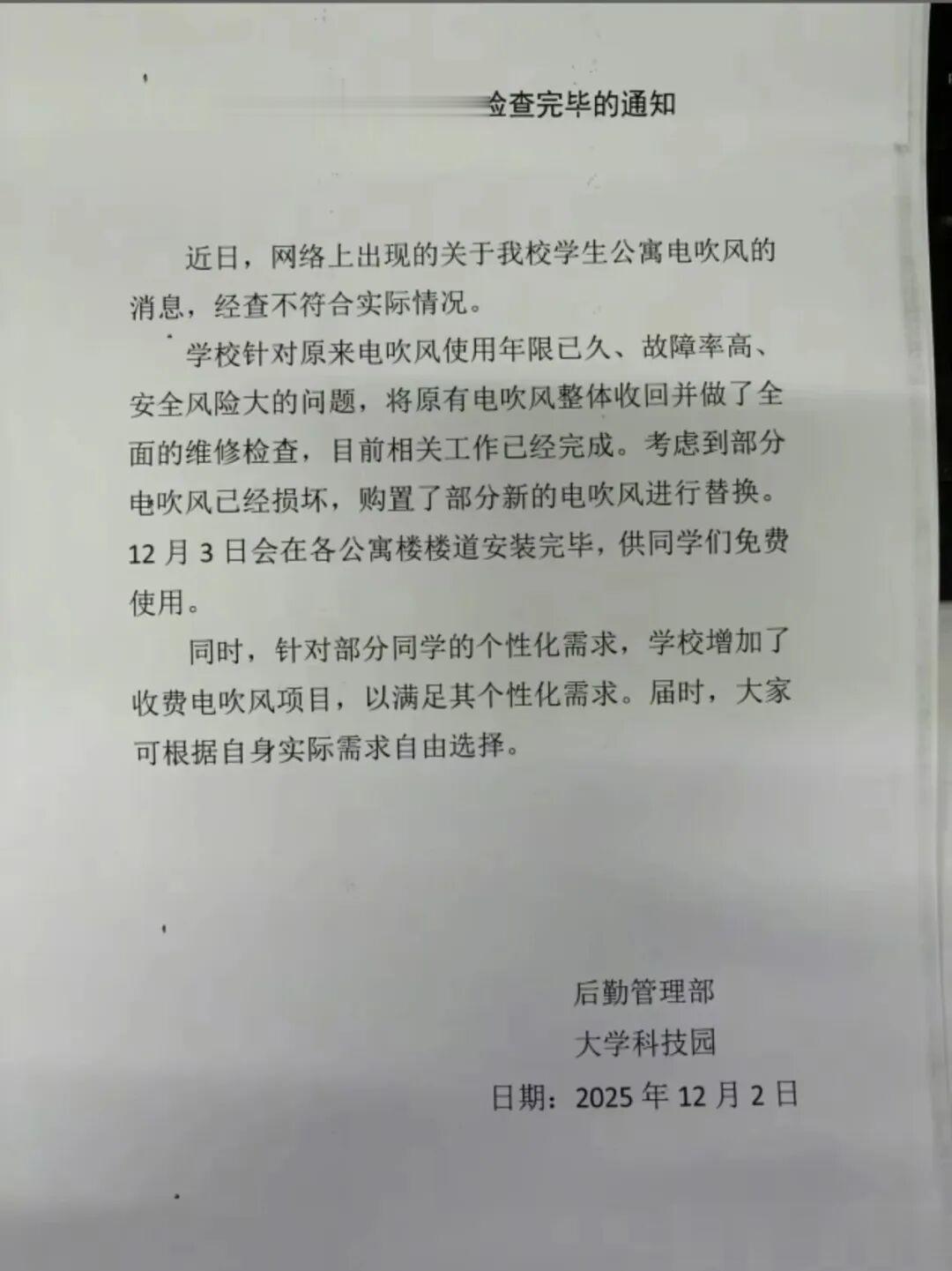 12月5日,记者联系上一位中北大学在读的学生。该学生介绍,宿舍吹风机收费标准分为三分钟0.5元、五分钟0.8元两种。同时,该同学还提供了一张宿舍楼内张贴的《关于公寓电吹风维修检查完毕的通知》照片。这份由学校后勤管理部与大学科技园于12月2日发布的通知提到:学校针对原来电吹风使用年限已久,故障率高、安全风险大的问题,将原有电吹风整体回收做全面的维修检查,目前相关工作已经完成,替换了部分损坏的电吹风并重新安装,供免费使用。同时,针对部分学生的个性化需求,学校增加了收费电吹风项目。