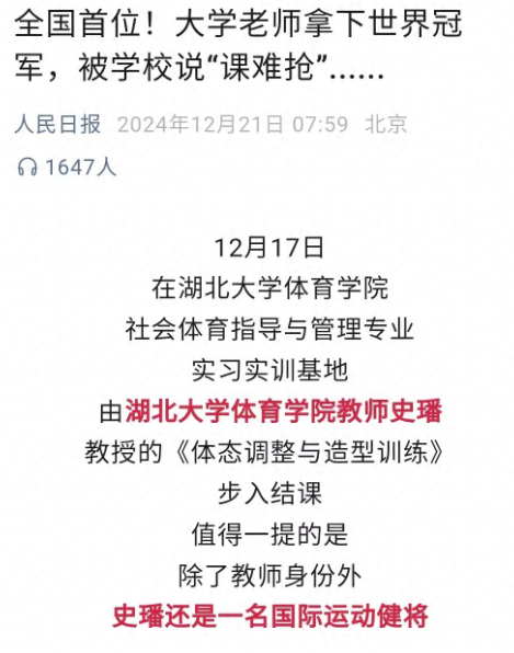 作为一名大学女教师,史璠为学生们讲解的课程也是与健身有关,其中就包括《动态拉伸与抗阻训练》与《增肌减脂与塑形训练》这样的课程。更重要的是史璠不仅自己参加比赛,同时也指导那些对健身感兴趣的学生,帮助他们制定训练饮食计划以及制定比赛造型,最终起到了非常不错的效果:在2019年的时候,来自湖北大学的学生,斩获中国大学生健身健美锦标赛冠军,而史璠正是冠军得主的老师!