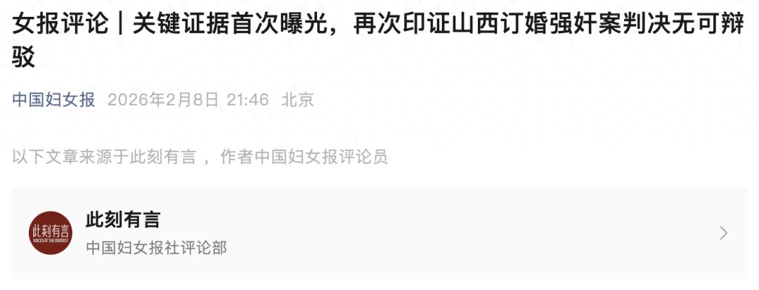 2月8日晚,中国妇女报微信公众号发表评论文章《关键证据首次曝光,再次印证山西订婚强奸案判决无可辩驳》