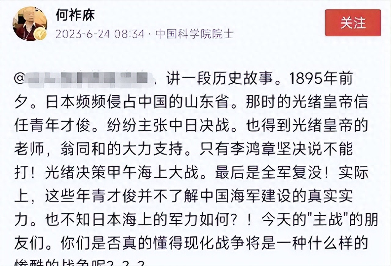 中国科学院院士何祚庥老先生曾经点名批评那些主战派,说要是真跟美国干起来,中国铁定吃亏,并拉出甲午战争那段旧账来提醒大家。