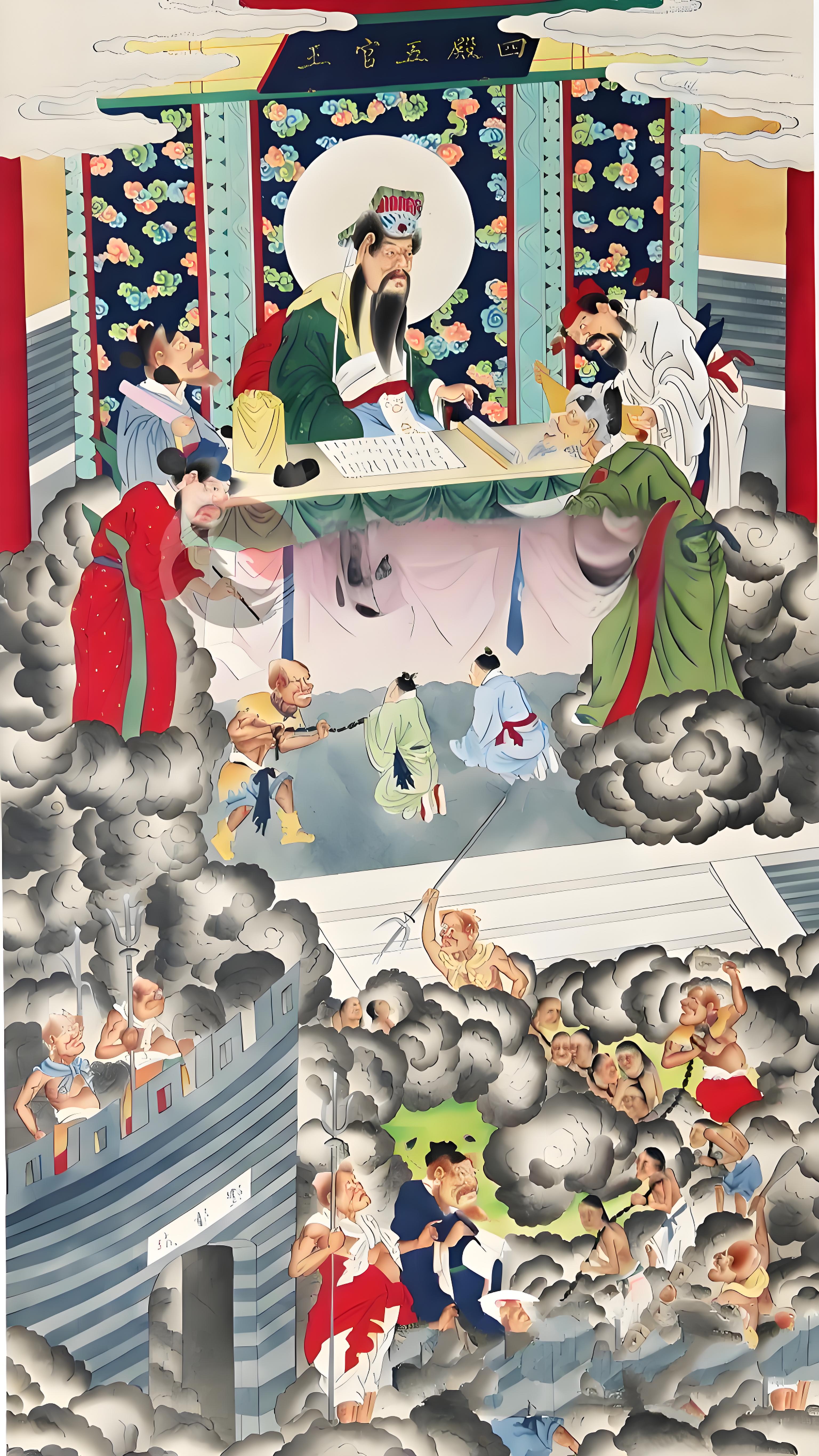 这十座殿堂,犹如明镜高悬,将人间万象中的种种罪恶,无论是明文律法所不容,还是道义伦理所谴责——诸如奢靡放纵、欺诈背叛、凶残暴虐、贪婪嫉妒、纵火奸淫、陷害不义、悖逆孝道、制假售假、盘剥弱小等种种恶行,悉数纳入审判之列。每一罪行,皆有其对应的地狱酷刑,如“刀山火海”、“铜柱炙烤”、“舌根拔断”、“筋骨摧折”、“心肝挤压”等,其惨烈程度超乎想象,意在使恶人在死后亦能体验到生前罪孽的严重后果。