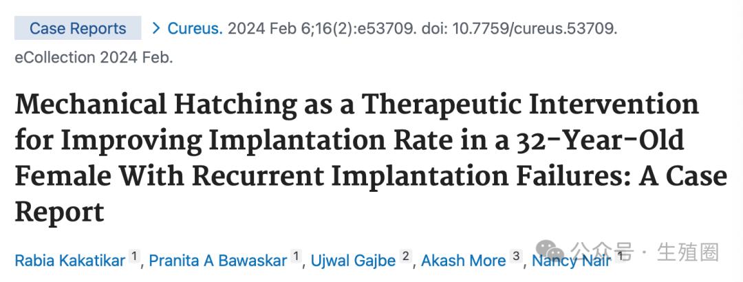 Mechanical Hatching as a Therapeutic Intervention for Improving Implantation Rate in a 32-Year-Old Female With Recurrent Implantation Failures: A Case Report. Cureus. 2024 Feb 6;16(2):e53709. doi: 10.7759/cureus.53709.