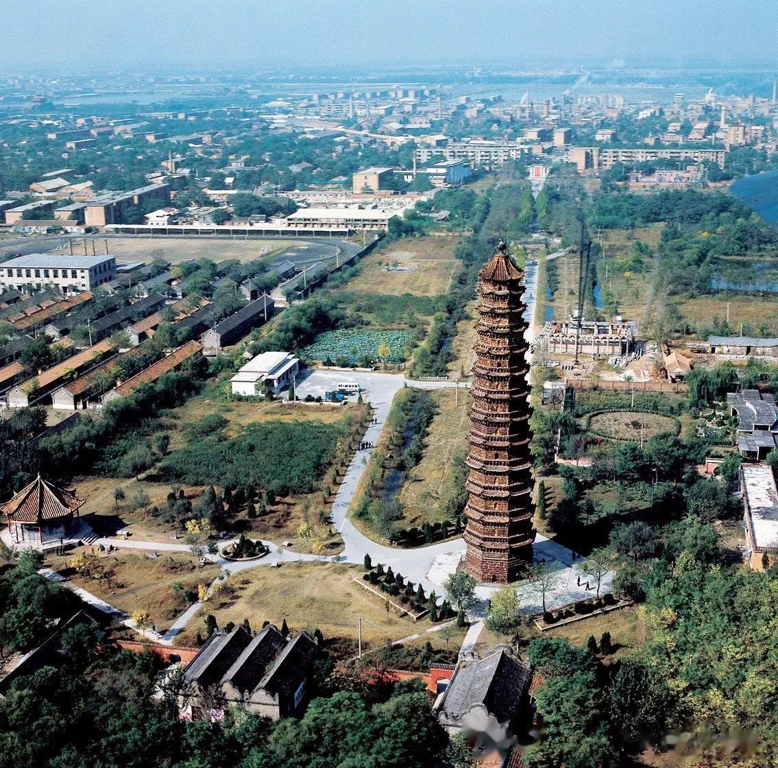 2、80年代开封八朝古都开封,地下城摞城。这是航拍角度当下的开封铁塔。塔身修长,褐色的琉璃砖让让它有了“铁塔”的美誉。当时的铁塔公园,跟现在不太一样。