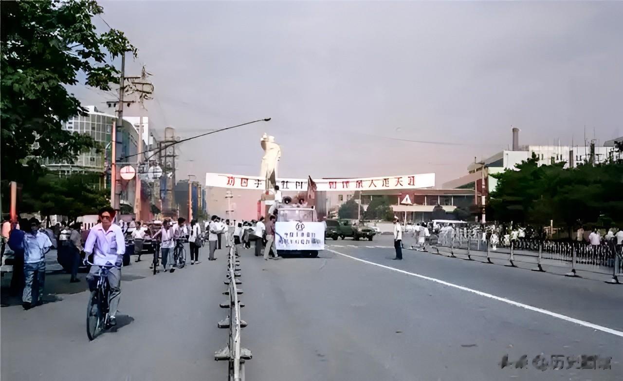 6、80年代鹤壁这张照片拍摄于40多年前鹤壁市区的红旗路上。街道宽阔笔直一眼望不到尽头。远处矗立的伟人雕塑,是老鹤壁人最难忘的记忆。