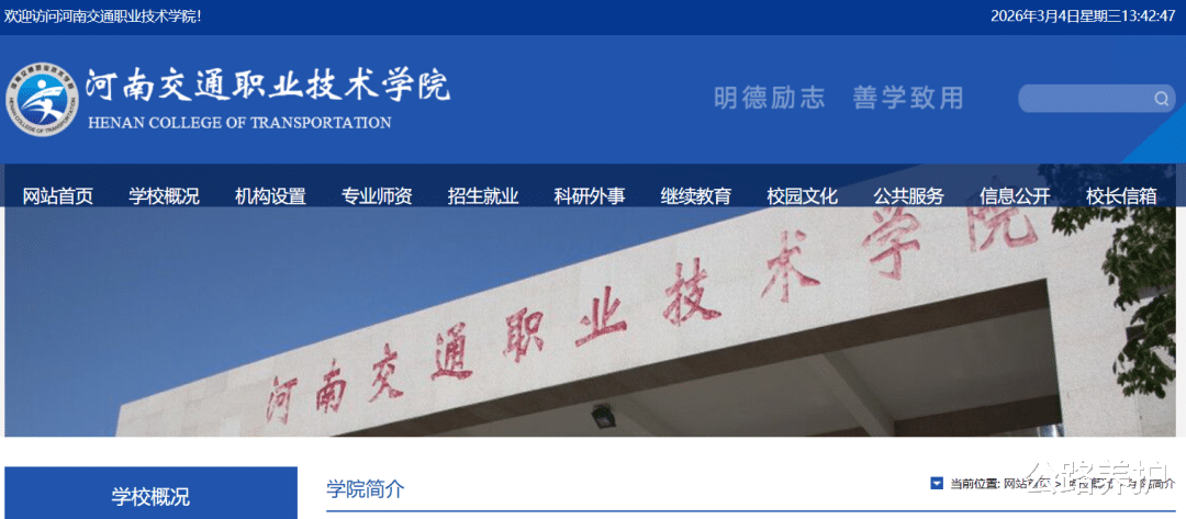 河南交通职业技术学院位于华夏文明的重要发祥地、国家历史文化名城、中国八大古都、全国重要的综合交通枢纽、国家中心城市郑州。学校创办于1953年,是一所交通特色鲜明的工科院校。学校历经河南省交通厅干部培训班、河南省交通运输干部学校、郑州交通专科学校、河南省交通学校等历史沿革。2004年,经河南省人民政府批准升格为高职院校;2014年,被命名为“河南省文明单位”;2015年,被省教育厅确定为“河南省职业教育品牌示范院校”,同年在全省率先开展定向培养直招士官工作;2018年,成为河南省博士后创新实践基地;2019年,被教育部确定为“国家级优质高等职业院校”,成为全国200所、全省9所获批院校之一;2020年,获评“河南省文明校园”,被省教育厅、财政厅、发展改革委确定为河南省“高职双高工程”建设单位;2021年,被教育部认定为首批全国急救教育试点学校;2022年,入选全国100所高职院校学生发展指数优秀院校、全国60所高职院校服务贡献典型院校;2023年,被人力资源和社会保障部认定为国家级博士后科研工作站,荣获河南省“文明校园标兵”、省“平安校园”省首批“新时代依法治校示范校”等荣誉称号。